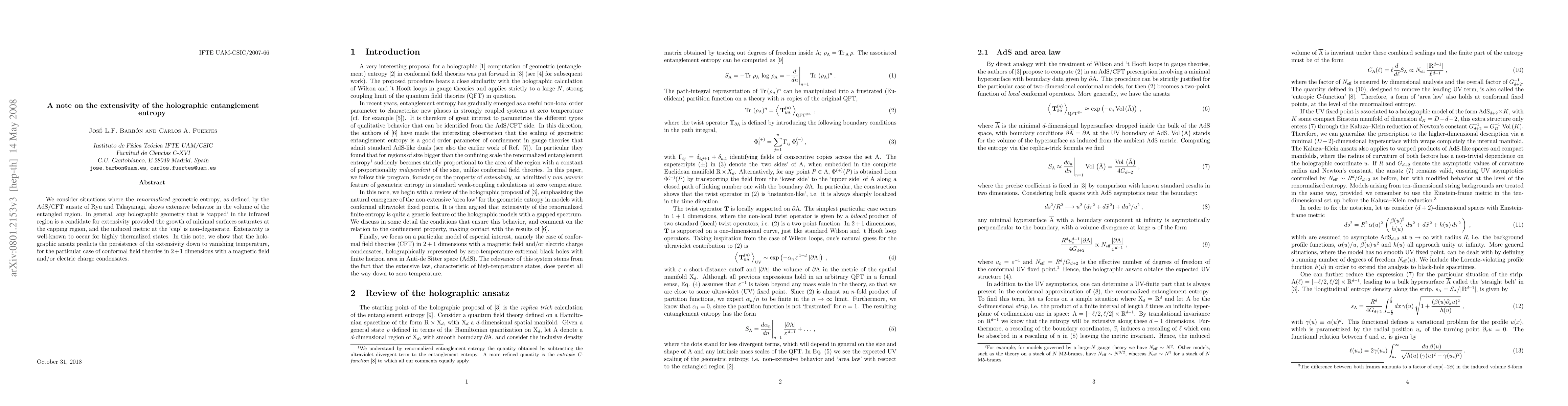 We consider situations where the renormalized geometric entropy, as defined by the AdS/CFT ansatz of Ryu and Takayanagi, shows extensive behavior in the volume of the entangled region. In general, any holographic geometry that is `capped' in the infrared region is a candidate for extensivity provided the growth of minimal surfaces saturates at the capping region, and the induced metric at the `cap' is non-degenerate. Extensivity is well-known to occur for highly thermalized states. In this note, we show that the holographic ansatz predicts the persistence of the extensivity down to vanishing temperature, for the particular case of conformal field theories in 2+1 dimensions with a magnetic field and/or electric charge condensates.