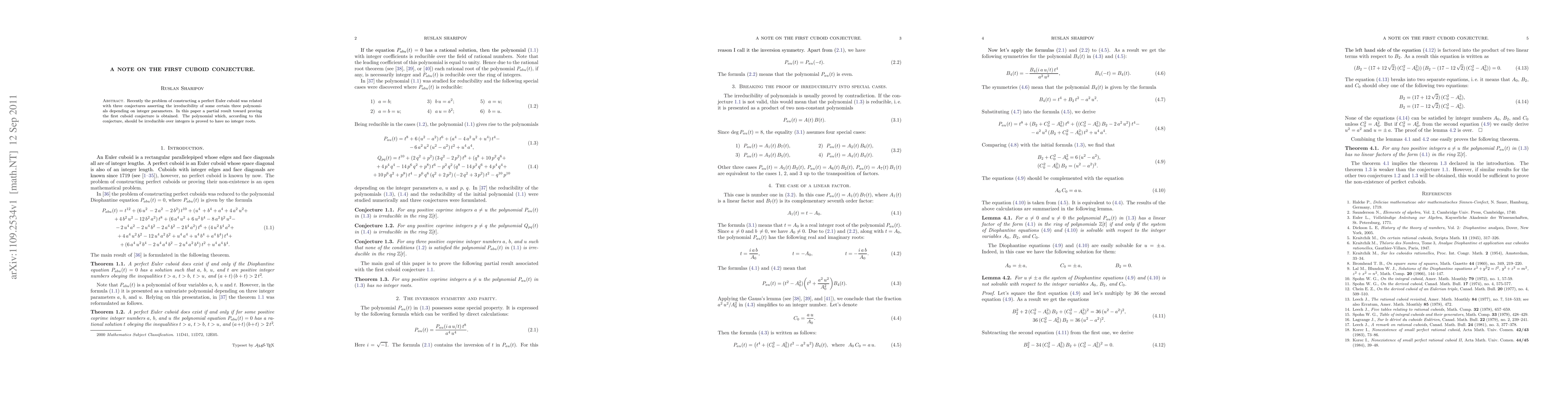 Recently the problem of constructing a perfect Euler cuboid was related with three conjectures asserting the irreducibility of some certain three polynomials depending on integer parameters. In this paper a partial result toward proving the first cuboid conjecture is obtained. The polynomial which, according to this conjecture, should be irreducible over integers is proved to have no integer roots.