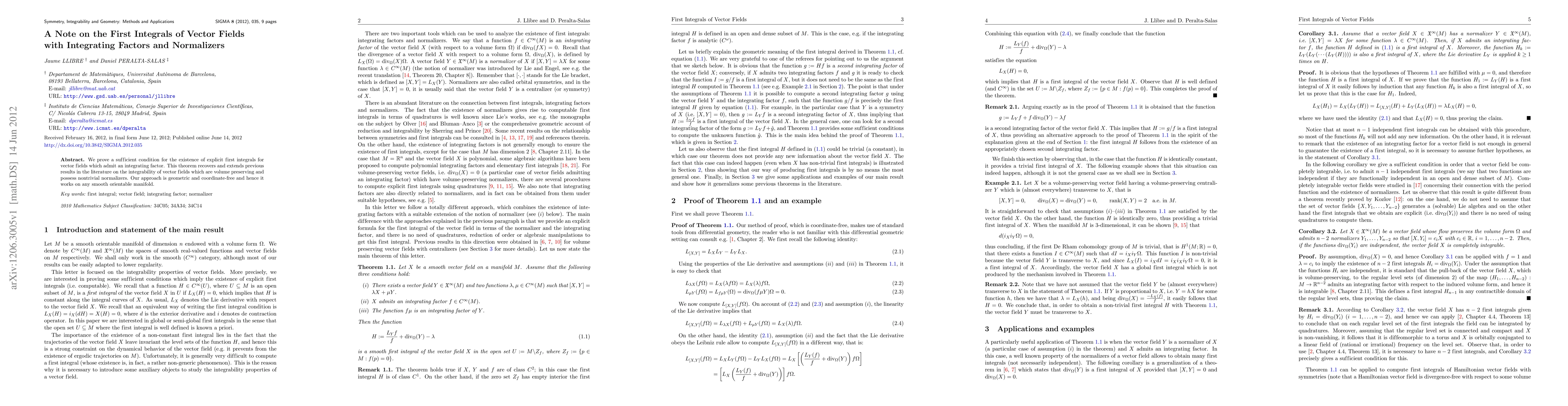 This paper establishes a sufficient condition for the existence of explicit first integrals for vector fields with integrating factors, extending previous results on volume-preserving vector fields with nontrivial normalizers. The geometric, coordinate-free approach applies to any smooth orientable manifold.