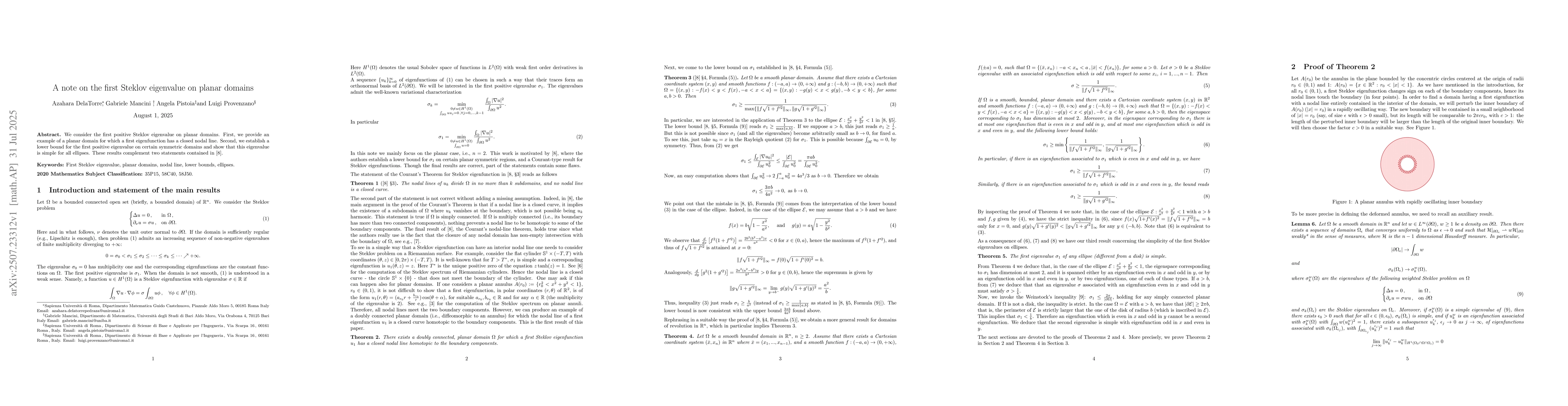 The paper presents a planar domain example with a first Steklov eigenfunction featuring a closed nodal line. It also offers a lower bound for the first eigenvalue on symmetric domains and confirms its simplicity for ellipses, complementing previous findings by Kuttler and Sigillito.