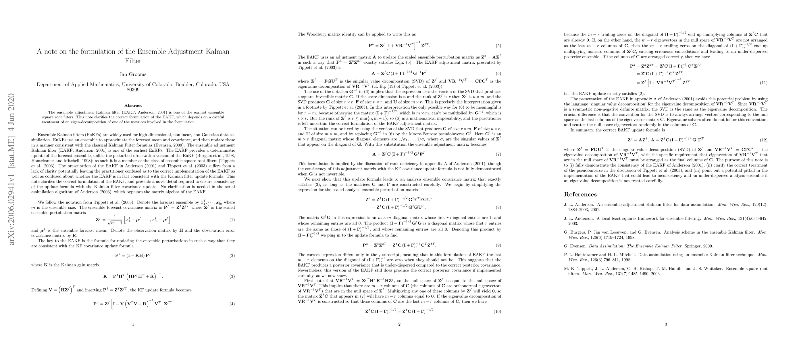 Summary: This paper corrects the formulation of the ensemble adjustment Kalman filter (EAKF) by emphasizing the importance of eigen-decomposition in the matrix involved, providing a clearer understanding of the EAKF methodology.