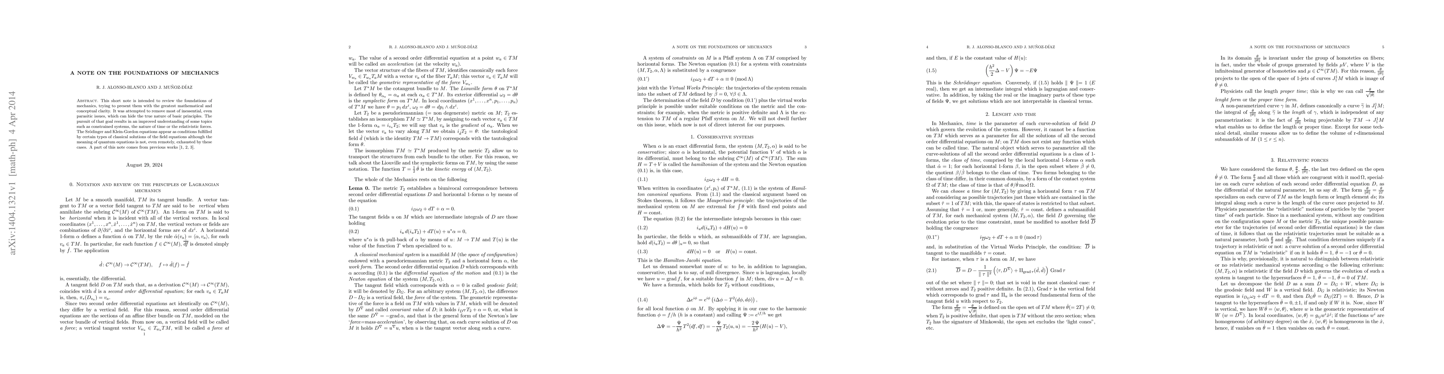 This short note is intended to review the foundations of mechanics, trying to present them with the greatest mathematical and conceptual clarity. It was attempted to remove most of inessential, even parasitic issues, which can hide the true nature of basic principles. The pursuit of that goal results in an improved understanding of some topics such as constrained systems, the nature of time or the relativistic forces. The Sr\"odinger and Klein-Gordon equations appear as conditions fulfilled by certain types of classical solutions of the field equations although the meaning of quantum equations is not, even remotely, exhausted by these cases. A part of this note comes from previous works.
