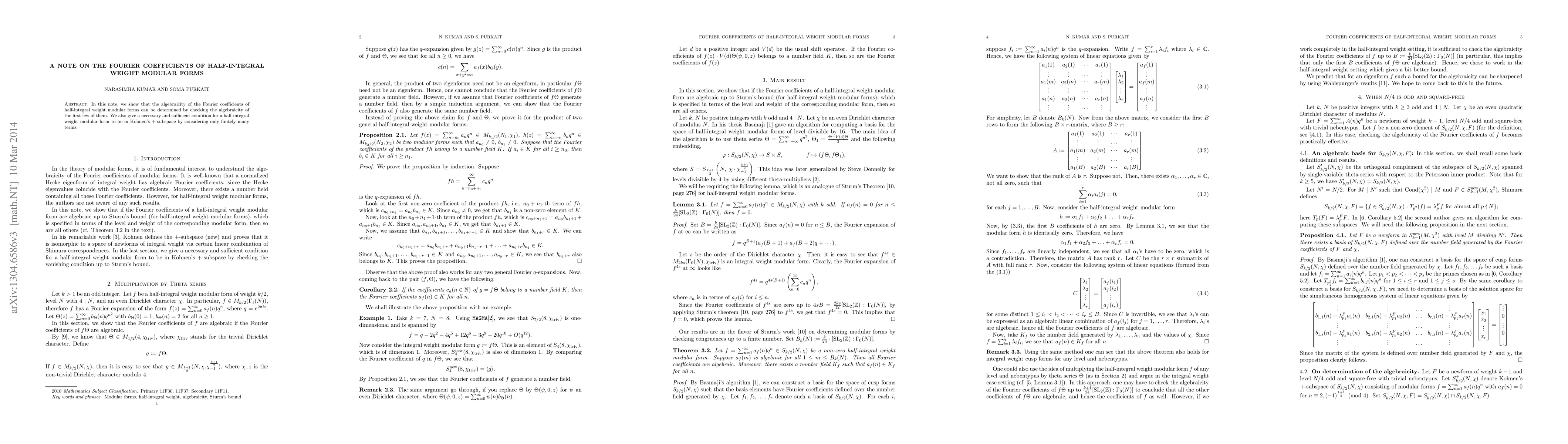 In this note, we show that the algebraicity of the Fourier coefficients of half-integral weight modular forms can be determined by checking the algebraicity of the first few of them. We also give a necessary and sufficient condition for a half-integral weight modular form to be in Kohnen's +-subspace by considering only finitely many terms.