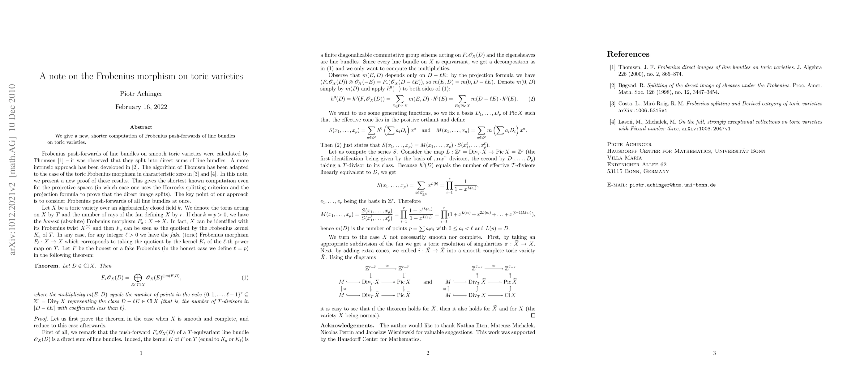 We give a new, shorter computation of Frobenius push-forwards of line bundles on toric varieties.