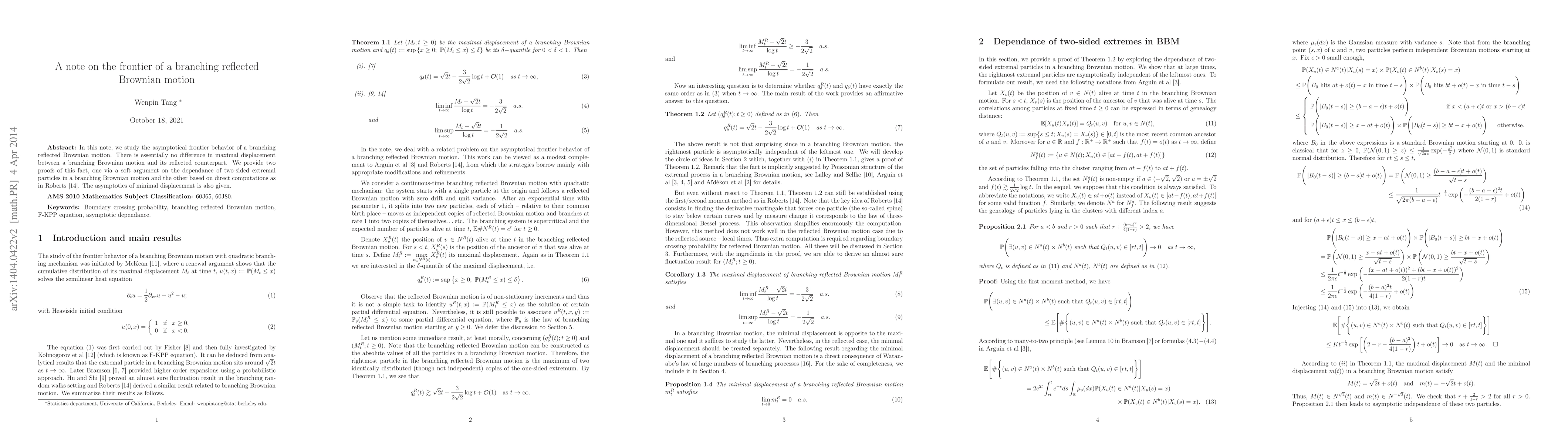 In this note, we study the asymptotical frontier behavior of a branching reflected Brownian motion. There is essentially no difference in maximal displacement between a branching Brownian motion and its reflected counterpart. We provide two proofs of this fact, one via a soft argument on the dependance of two-sided extremal particles in a branching Brownian motion and the other based on direct computations as in Roberts. The asymptotics of minimal displacement is also given.
