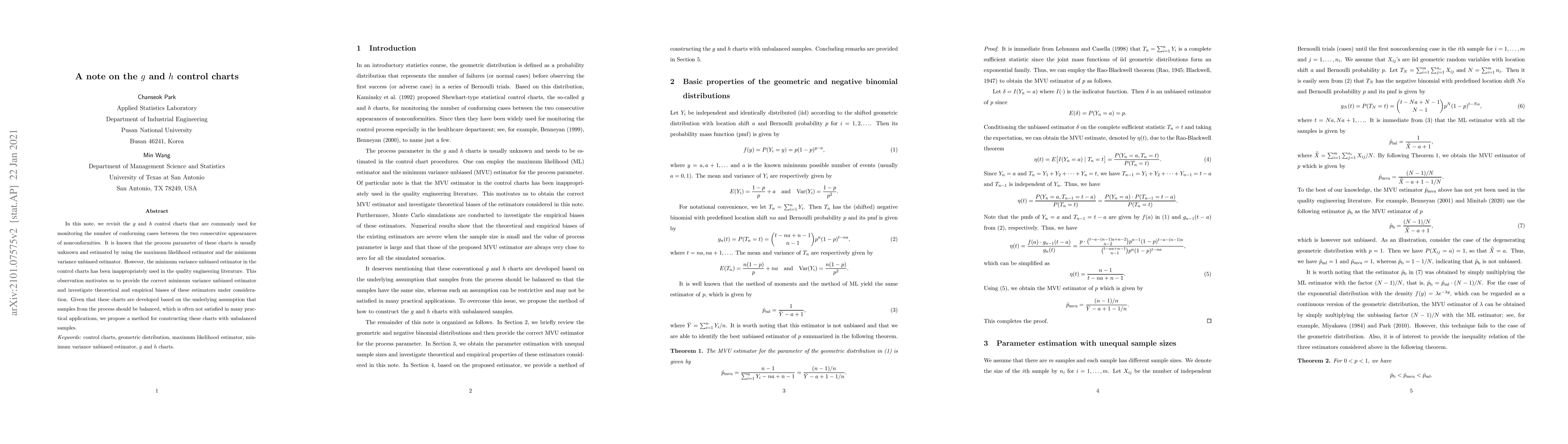 In this note, we revisit the $g$ and $h$ control charts that are commonly used for monitoring the number of conforming cases between the two consecutive appearances of nonconformities. It is known that the process parameter of these charts is usually unknown and estimated by using the maximum likelihood estimator and the minimum variance unbiased estimator. However, the minimum variance unbiased estimator in the control charts has been inappropriately used in the quality engineering literature. This observation motivates us to provide the correct minimum variance unbiased estimator and investigate theoretical and empirical biases of these estimators under consideration. Given that these charts are developed based on the underlying assumption that samples from the process should be balanced, which is often not satisfied in many practical applications, we propose a method for constructing these charts with unbalanced samples.