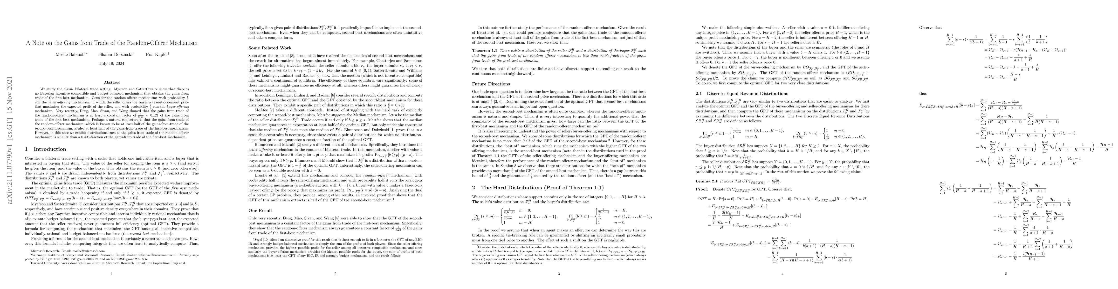 We study the classic bilateral trade setting. Myerson and Satterthwaite show that there is no Bayesian incentive compatible and budget-balanced mechanism that obtains the gains from trade of the first-best mechanism. Consider the random-offerer mechanism: with probability $\frac{1}{2}$ run the \emph{seller-offering} mechanism, in which the seller offers the buyer a take-it-or-leave-it price that maximizes the expected profit of the seller, and with probability $\frac{1}{2}$ run the \emph{buyer-offering} mechanism. Very recently, Deng, Mao, Sivan, and Wang showed that the gains from trade of the random-offerer mechanism is at least a constant factor of $\frac 1 {8.23}\approx 0.121$ of the gains from trade of the first best mechanism. Perhaps a natural conjecture is that the gains-from-trade of the random-offerer mechanism, which is known to be at least half of the gains-from-trade of the second-best mechanism, is also at least half of the gains-from-trade of the first-best mechanism. However, in this note we exhibit distributions such as the gains-from trade of the random-offerer mechanism is smaller than a $0.495$-fraction of the gains-from-trade of the first-best mechanism.