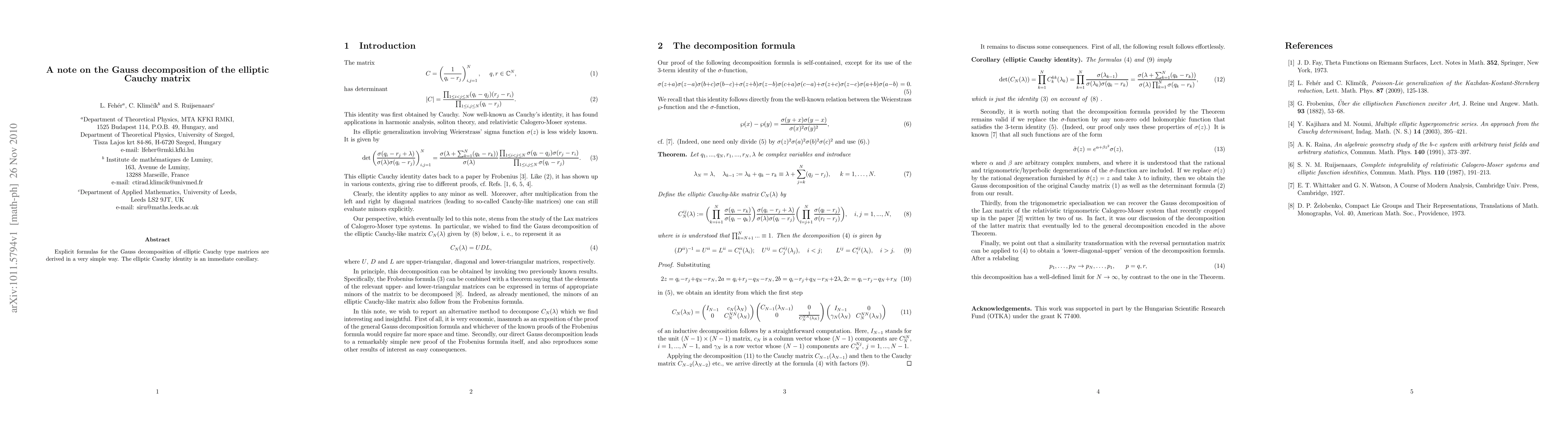 Summary: This paper presents straightforward derivations for the Gauss decomposition of elliptic Cauchy matrices and derives the elliptic Cauchy identity as a direct consequence.