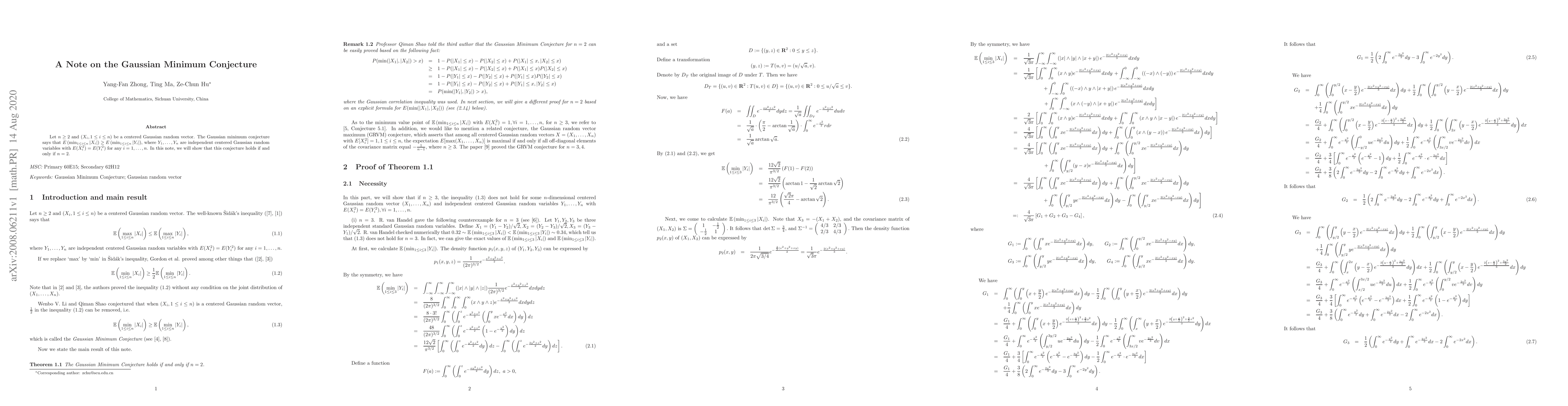 Let $n\geq 2$ and $(X_i,1\leq i\leq n)$ be a centered Gaussian random vector. The Gaussian minimum conjecture says that $E\left(\min_{1\leq i\leq n}|X_i|\right)\geq E\left(\min_{1\leq i\leq n}|Y_i|\right)$, where $Y_1,\ldots,Y_n$ are independent centered Gaussian random variables with $E(X_i^2)=E(Y_i^2)$ for any $i=1,\ldots,n$. In this note, we will show that this conjecture holds if and only if $n=2$.