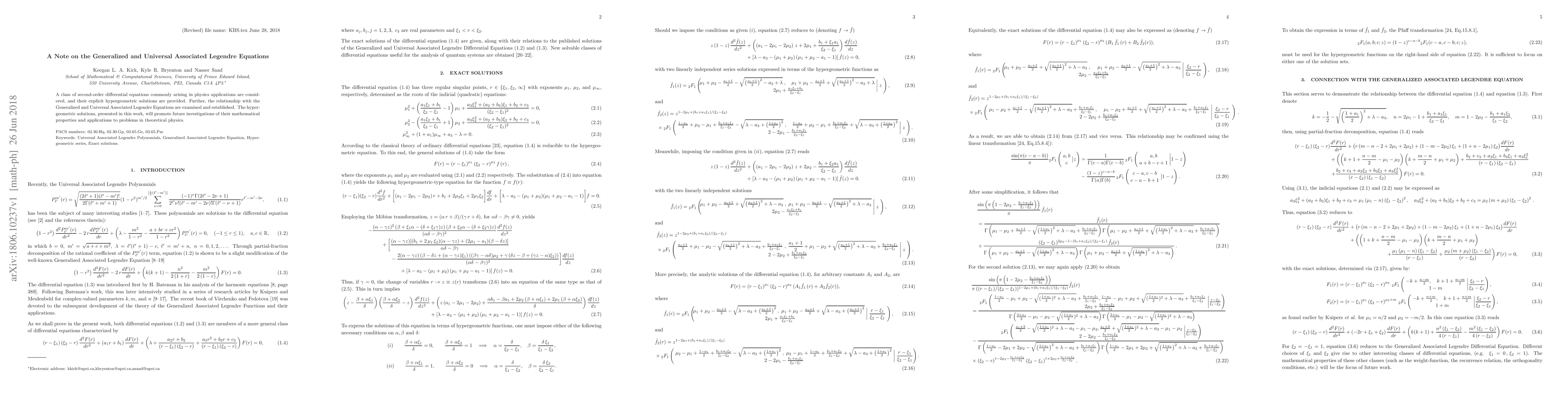 A class of second-order differential equations commonly arising in physics applications are considered, and their explicit hypergeometric solutions are provided. Further, the relationship with the Generalized and Universal Associated Legendre Equations are examined and established. The hypergeometric solutions, presented in this work, will promote future investigations of their mathematical properties and applications to problems in theoretical physics.