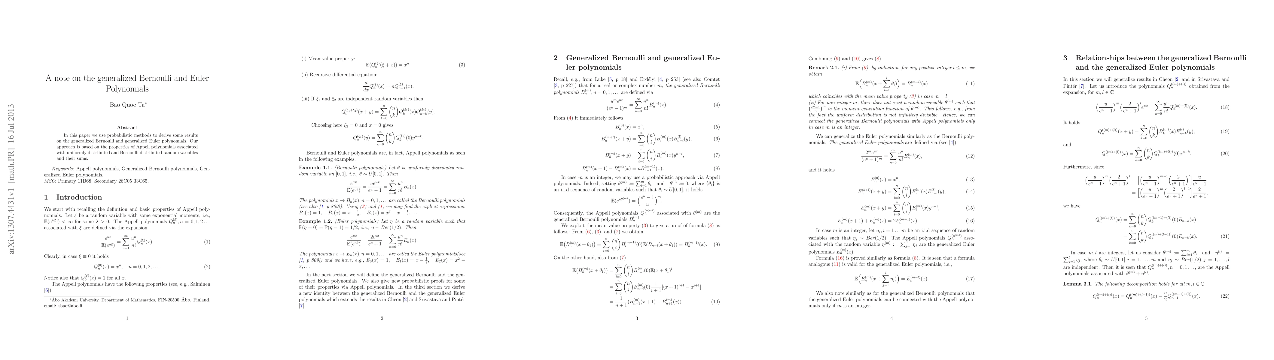 This paper derives results on generalized Bernoulli and Euler polynomials using probabilistic methods, leveraging properties of Appell polynomials tied to uniformly and Bernoulli distributed random variables and their sums.