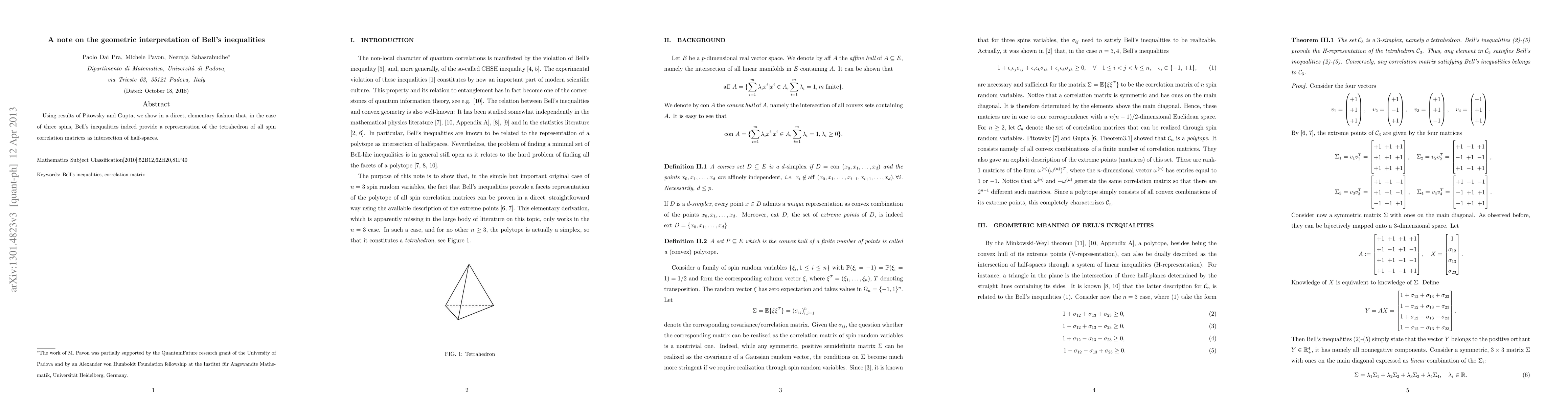 Using results of Pitowsky and Gupta, we show in a direct, elementary fashion that, in the case of three spins, Bell's inequalities indeed provide a representation of the tetrahedron of all spin correlation matrices as intersection of half-spaces.