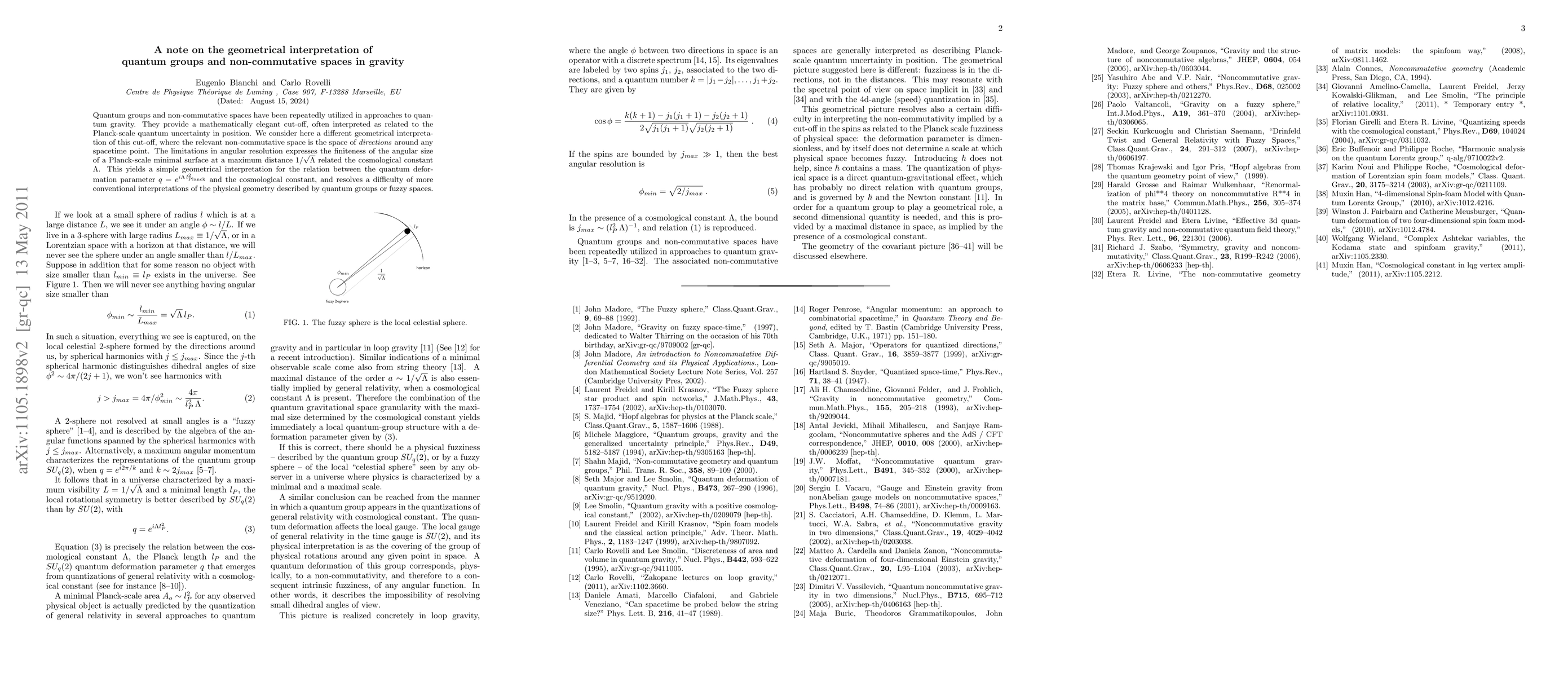 Quantum groups and non-commutative spaces have been repeatedly utilized in approaches to quantum gravity. They provide a mathematically elegant cut-off, often interpreted as related to the Planck-scale quantum uncertainty in position. We consider here a different geometrical interpretation of this cut-off, where the relevant non-commutative space is the space of directions around any spacetime point. The limitations in angular resolution expresses the finiteness of the angular size of a Planck-scale minimal surface at a maximum distance 1/\sqrt{Lambda} related the cosmological constant Lambda. This yields a simple geometrical interpretation for the relation between the quantum deformation parameter q=exp[i Lambda l_{Planck}^2 ] and the cosmological constant, and resolves a difficulty of more conventional interpretations of the physical geometry described by quantum groups or fuzzy spaces.