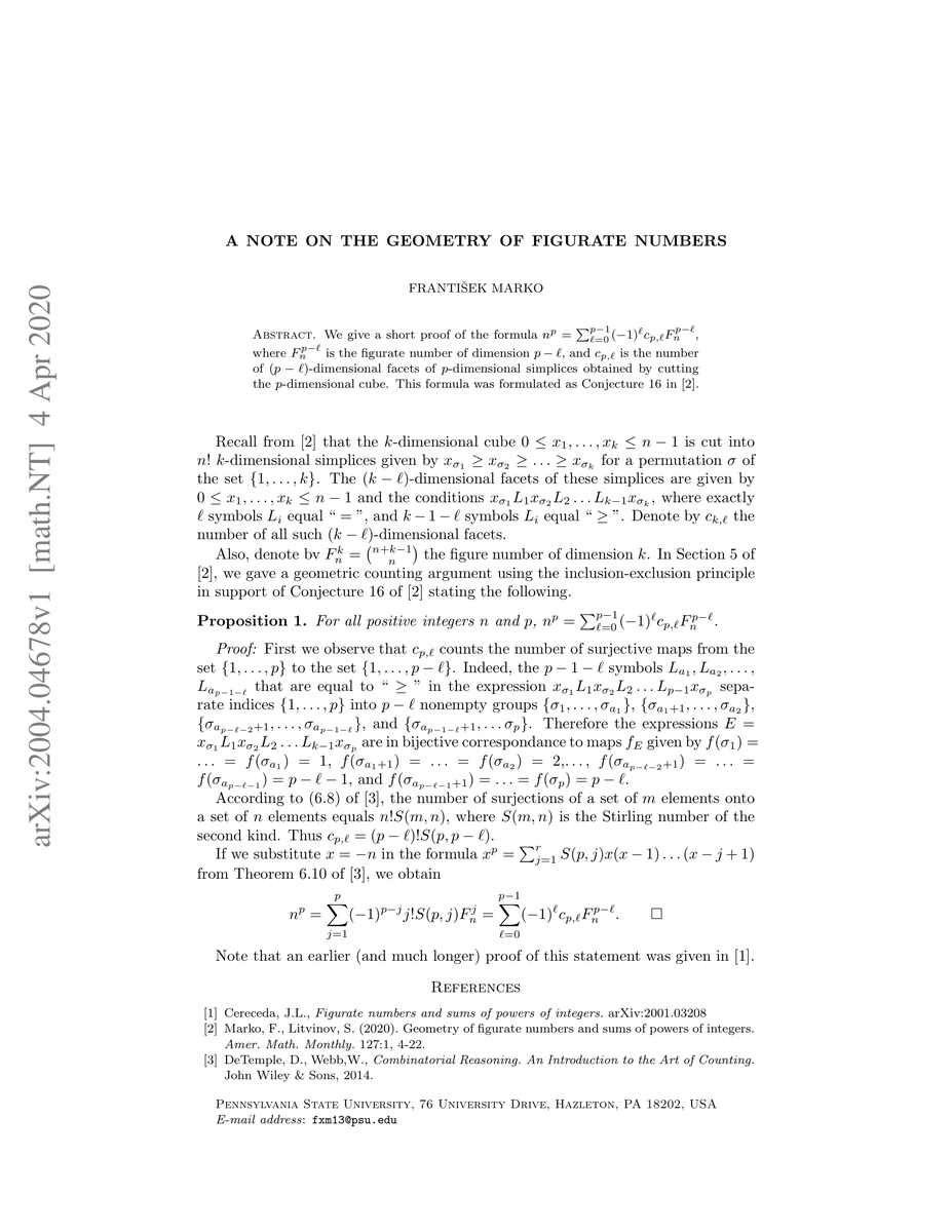 We give a short proof of the formula $n^p=\sum_{\ell=0}^{p-1} (-1)^{\ell} c_{p,\ell} F^{p-\ell}_n$, where $F^{p-\ell}_n$ is the figurate number and $c_{p,\ell}$ is the number of $(p-\ell)$-dimensional facets of $p$-dimensional simplices obtained by cutting the $p$-dimensional cube.