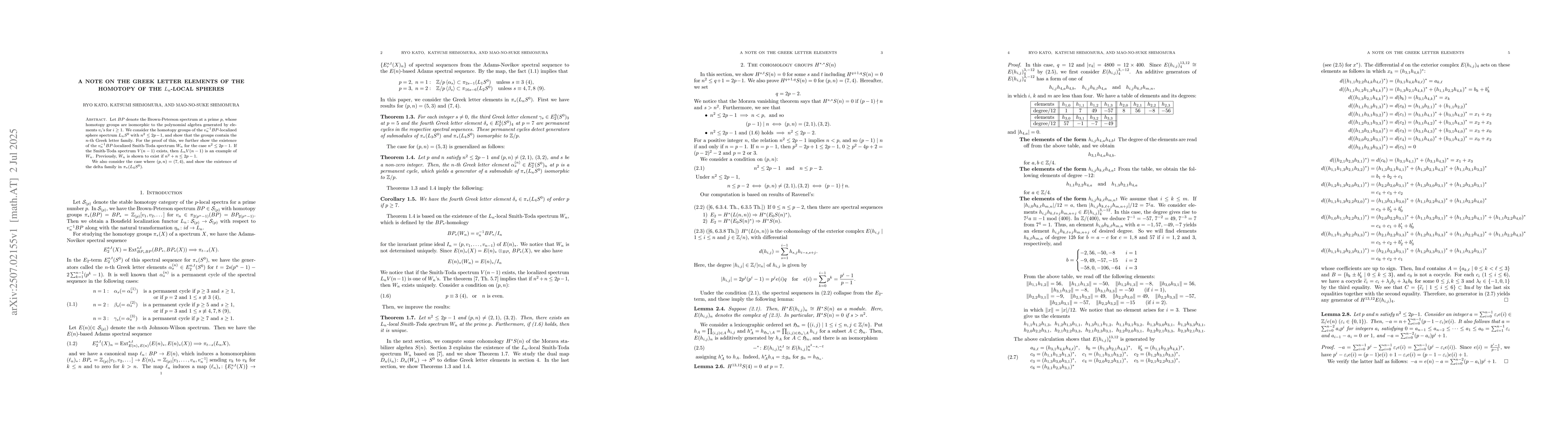 Let $BP$ denote the Brown-Peterson spectrum at a prime $p$, whose homotopy groups are isomorphic to the polynomial algebra generated by elements $v_i$'s for $i\ge 1$. We consider the homotopy groups of the $v_n^{-1}BP$-localized sphere spectrum $L_nS^0$ with $n^2\le 2p-1$, and show that the groups contain the $n$-th Greek letter family. For the proof of this, we further show the existence of the $v_n^{-1}BP$-localized Smith-Toda spectrum $W_n$ for the case $n^2\le 2p-1$. If the Smith-Toda spectrum $V(n-1)$ exists, then $L_nV(n-1)$ is an example of $W_n$. Previously, $W_n$ is shown to exist if $n^2+n\le 2p-1$. We also consider the case where $(p,n)=(7,4)$, and show the existence of the delta family in $\pi_*(L_4S^0)$.