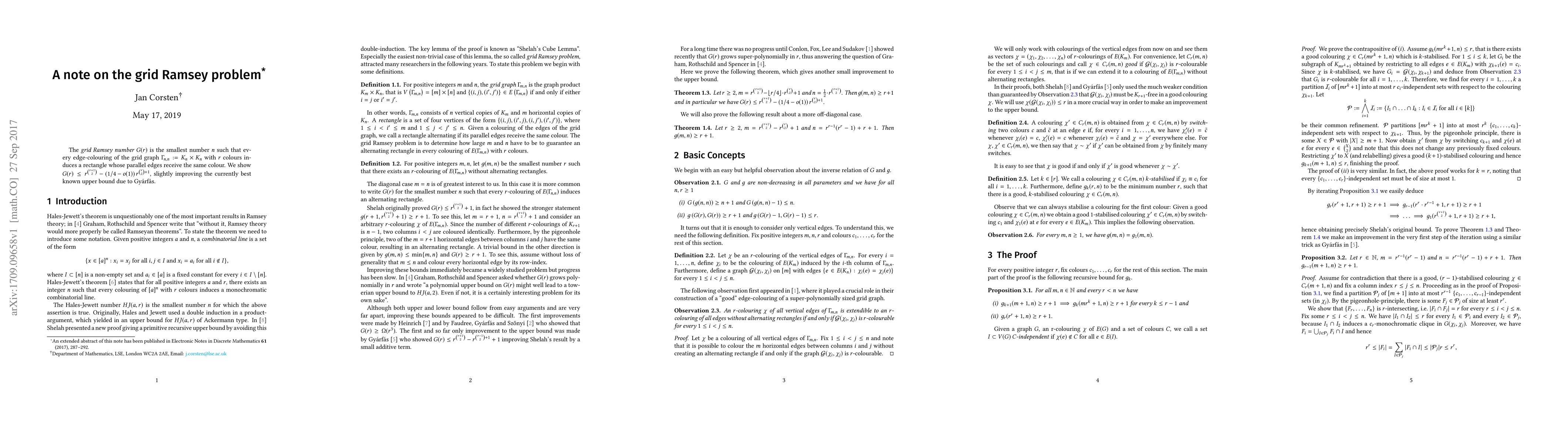 The grid Ramsey number $ G(r) $ is the smallest number $ n $ such that every edge-colouring of the grid graph $\Gamma_{n,n} := K_n \times K_n$ with $r$ colours induces a rectangle whose parallel edges receive the same colour. We show $ G(r) \leq r^{\binom{r+1}{2}} - \left( 1/4 - o(1) \right) r^{\binom{r}{2}+1} $, slightly improving the currently best known upper bound due to Gy\'arf\'as.