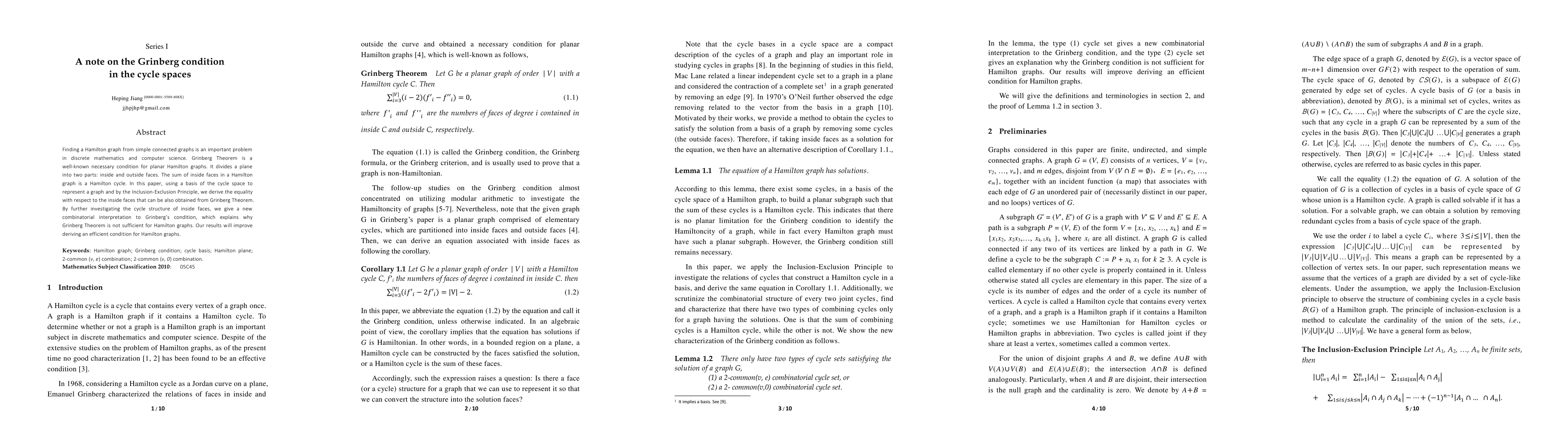 Finding a Hamilton graph from simple connected graphs is an important problem in discrete mathematics and computer science. Grinberg Theorem is a well-known necessary condition for planar Hamilton graphs. It divides a plane into two parts: inside and outside faces. The sum of inside faces in a Hamilton graph is a Hamilton cycle. In this paper, using a basis of the cycle space to represent a graph and by the Inclusion-Exclusion Principle, we derive the equality with respect to the inside faces that can be also obtained from Grinberg Theorem. By further investigating the cycle structure of inside faces, we give a new combinatorial interpretation to Grinberg's condition, which explains why Grinberg Theorem is not sufficient for Hamilton graphs. Our results will improve deriving an efficient condition for Hamilton graphs.