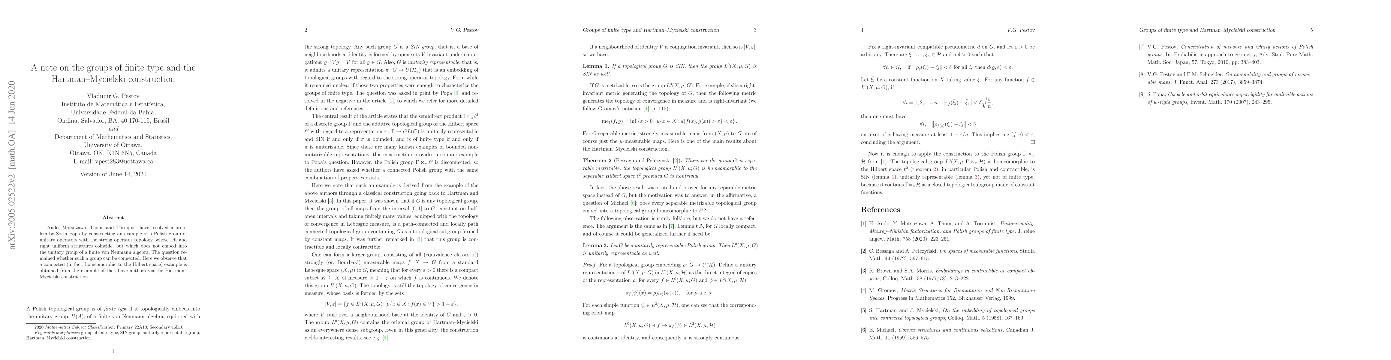 Ando, Matsuzawa, Thom, and T\"ornquist have resolved a problem by Sorin Popa by constructing an example of a Polish group of unitary operators with the strong operator topology, whose left and right uniform structures coincide, but which does not embed into the unitary group of a finite von Neumann algebra. The question remained whether such a group can be connected. Here we observe that a connected (in fact, homeomorphic to the Hilbert space) example is obtained from the example of the above authors via the Hartman--Mycielski construction.