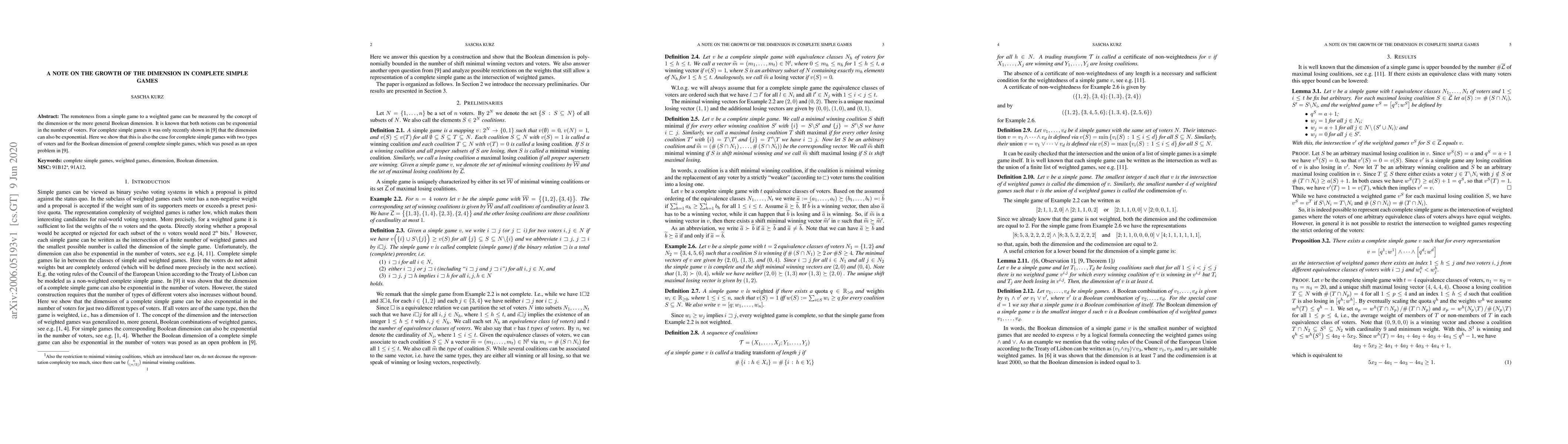 The remoteness from a simple game to a weighted game can be measured by the concept of the dimension or the more general Boolean dimension. It is known that both notions can be exponential in the number of voters. For complete simple games it was only recently shown that the dimension can also be exponential. Here we show that this is also the case for complete simple games with two types of voters and for the Boolean dimension of general complete simple games, which was posed as an open problem.
