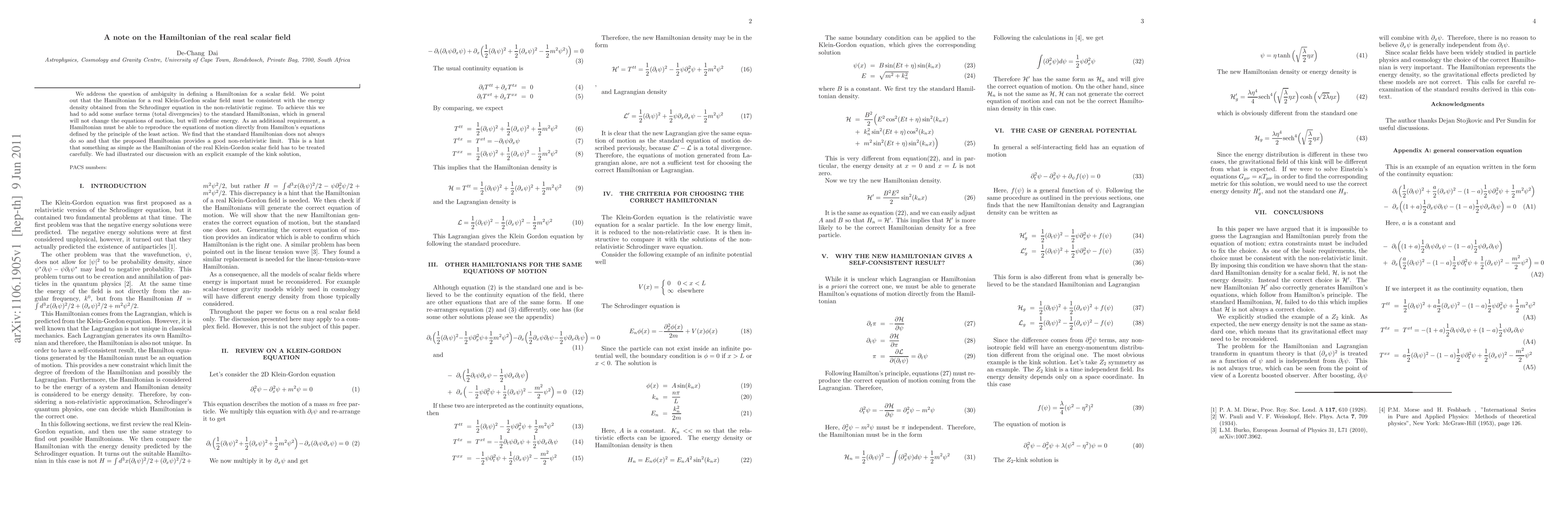 We address the question of ambiguity in defining a Hamiltonian for a scalar field. We point out that the Hamiltonian for a real Klein-Gordon scalar field must be consistent with the energy density obtained from the Schrodinger equation in the non-relativistic regime. To achieve this we had to add some surface terms (total divergencies) to the standard Hamiltonian, which in general will not change the equations of motion, but will redefine energy. As an additional requirement, a Hamiltonian must be able to reproduce the equations of motion directly from Hamilton's equations defined by the principle of the least action. We find that the standard Hamiltonian does not always do so and that the proposed Hamiltonian provides a good non-relativistic limit. This is a hint that something as simple as the Hamiltonian of the real Klein-Gordon scalar field has to be treated carefully. We had illustrated our discussion with an explicit example of the kink solution.
