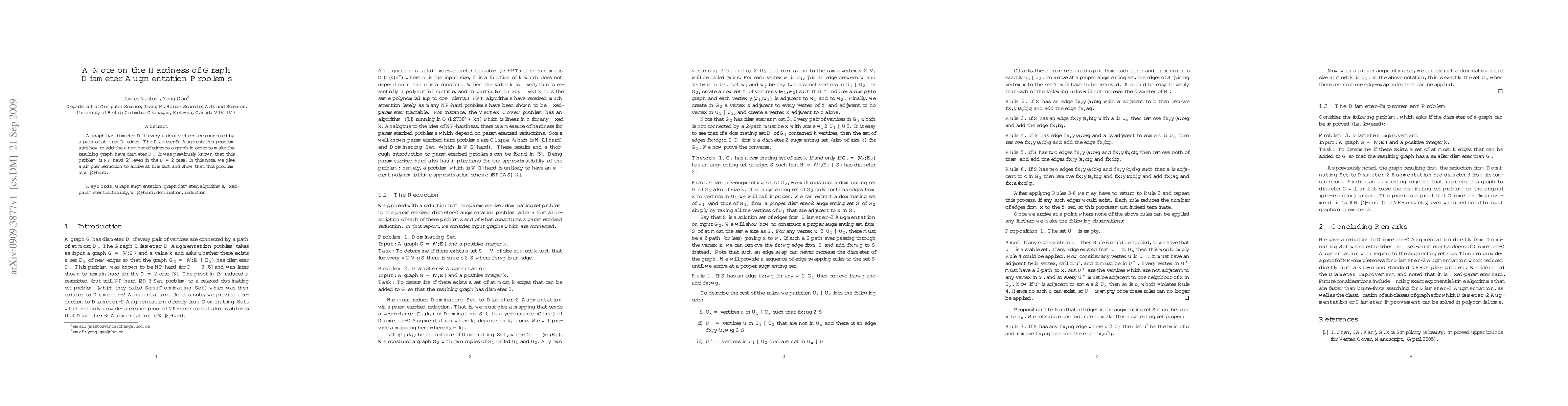 A graph has \emph{diameter} D if every pair of vertices are connected by a path of at most D edges. The Diameter-D Augmentation problem asks how to add the a number of edges to a graph in order to make the resulting graph have diameter D. It was previously known that this problem is NP-hard \cite{GJ}, even in the D=2 case. In this note, we give a simpler reduction to arrive at this fact and show that this problem is W[2]-hard.