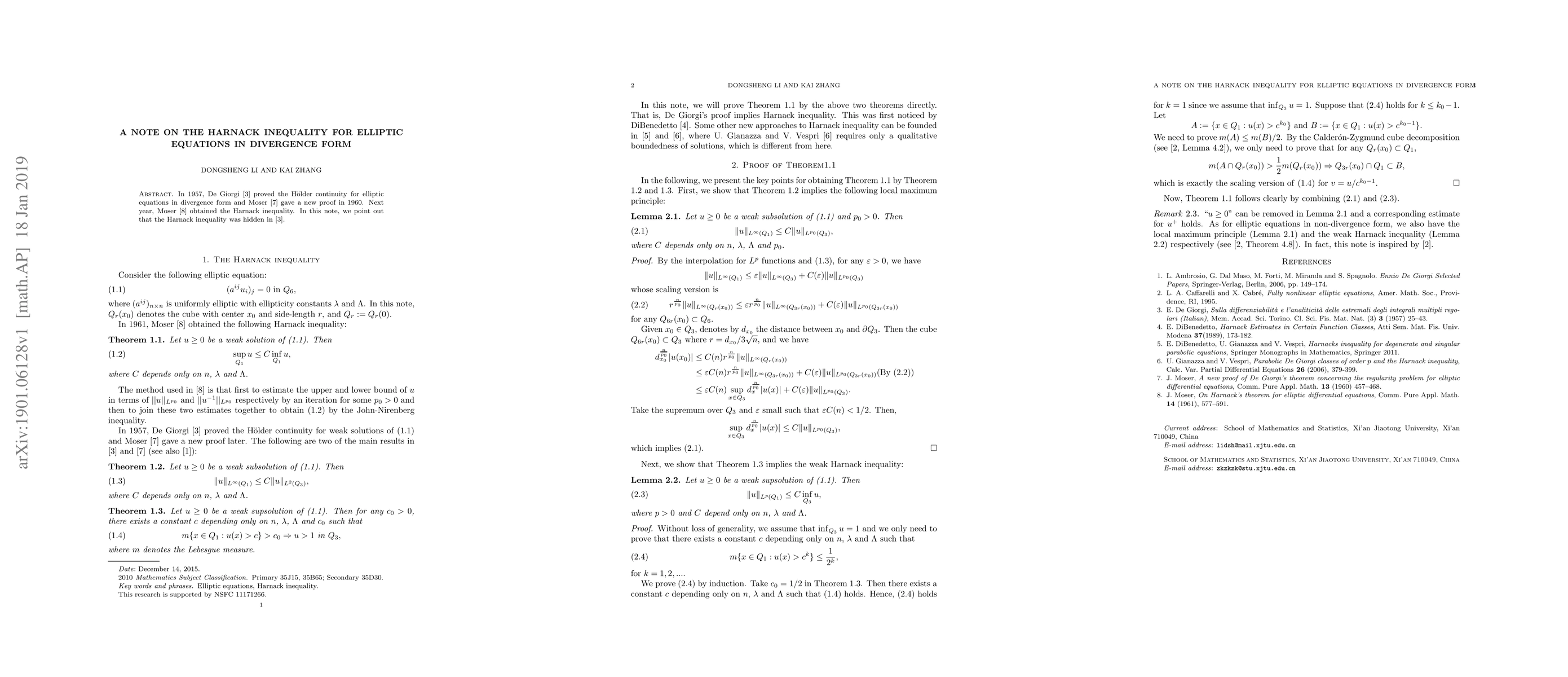 In 1957, De Giorgi [3] proved the H\"{o}lder continuity for elliptic equations in divergence form and Moser [7] gave a new proof in 1960. Next year, Moser [8] obtained the Harnack inequality. In this note, we point out that the Harnack inequality was hidden in [3].
