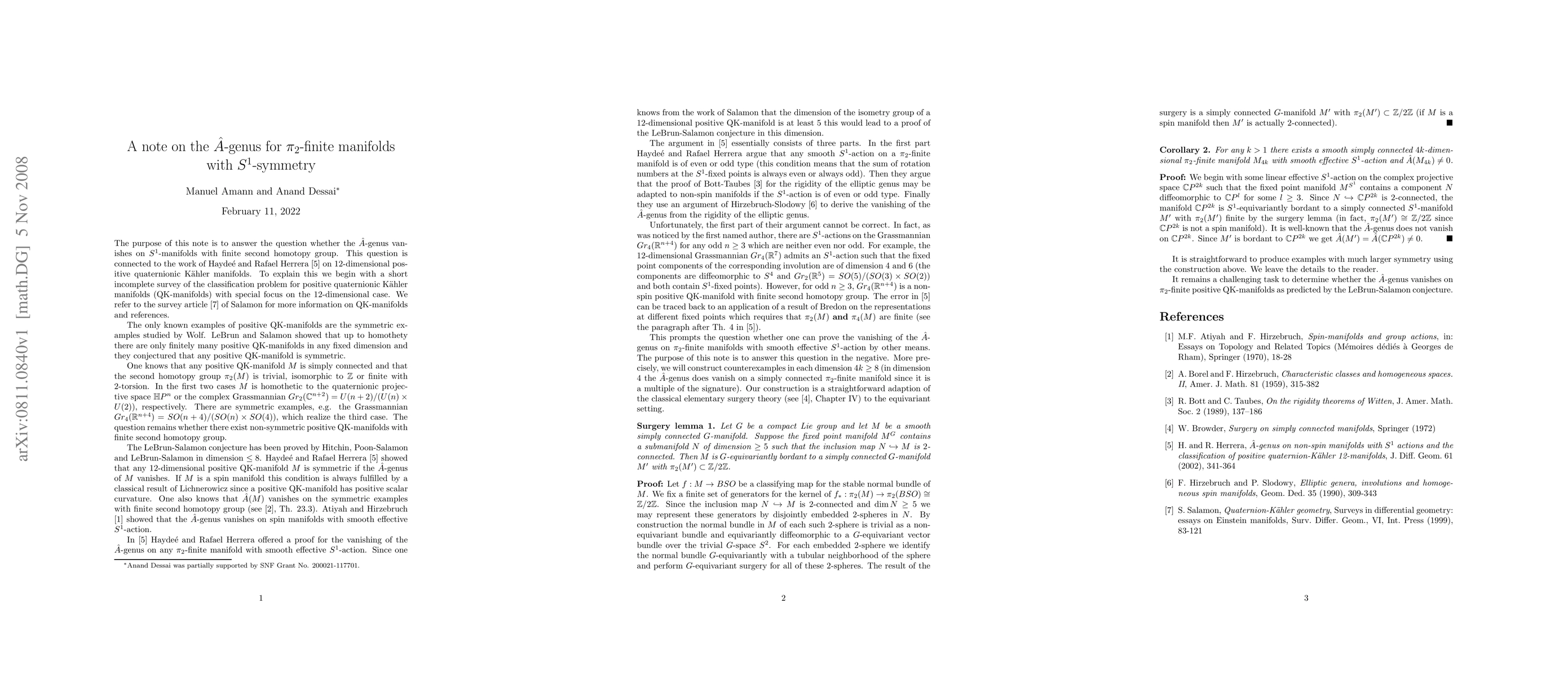 We construct examples of $S^1$-manifolds with finite second homotopy group and non-vanishing $\hat A$-genus. This is related to the classification of positive quaternionic Kaehler manifolds.