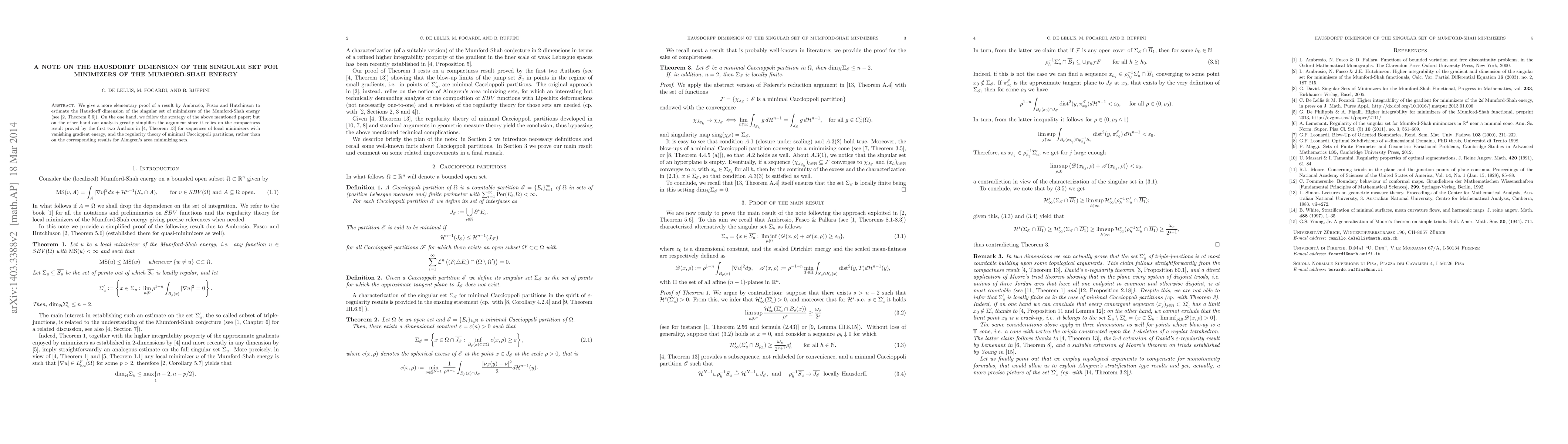 This paper provides a simplified proof for estimating the Hausdorff dimension of the singular set in minimizers of the Mumford-Shah energy, leveraging compactness results and minimal Caccioppoli partitions instead of relying on area minimizing sets. The approach follows the strategy of a previous result by Ambrosio, Fusco, and Hutchinson but offers a more elementary analysis.