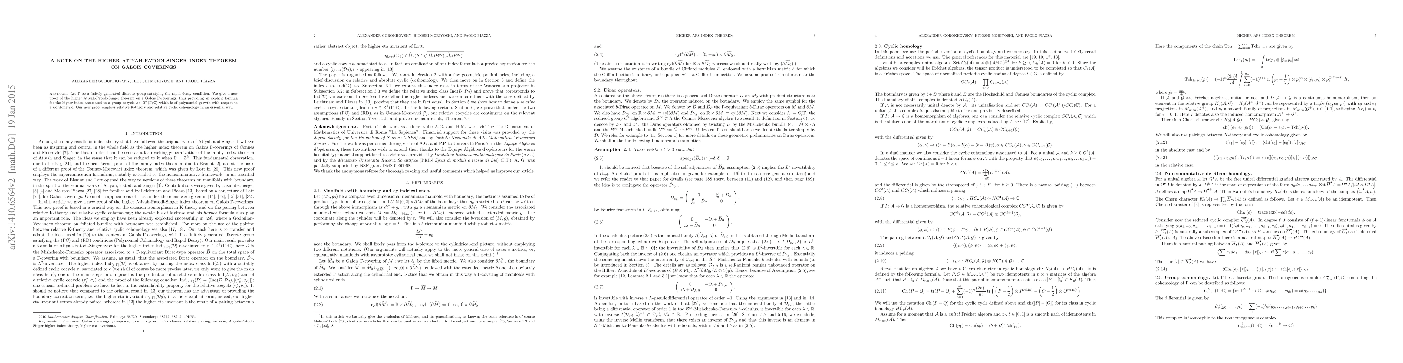Let $\Gamma$ be a finitely generated discrete group satisfying the rapid decay condition. We give a new proof of the higher Atiyah-Patodi-Singer theorem on a Galois $\Gamma$-coverings, thus providing an explicit formula for the higher index associated to a group cocycle $c\in Z^k (\Gamma;\mathbb{C})$ which is of polynomial growth with respect to a word-metric. Our new proof employs relative K-theory and relative cyclic cohomology in an essential way.