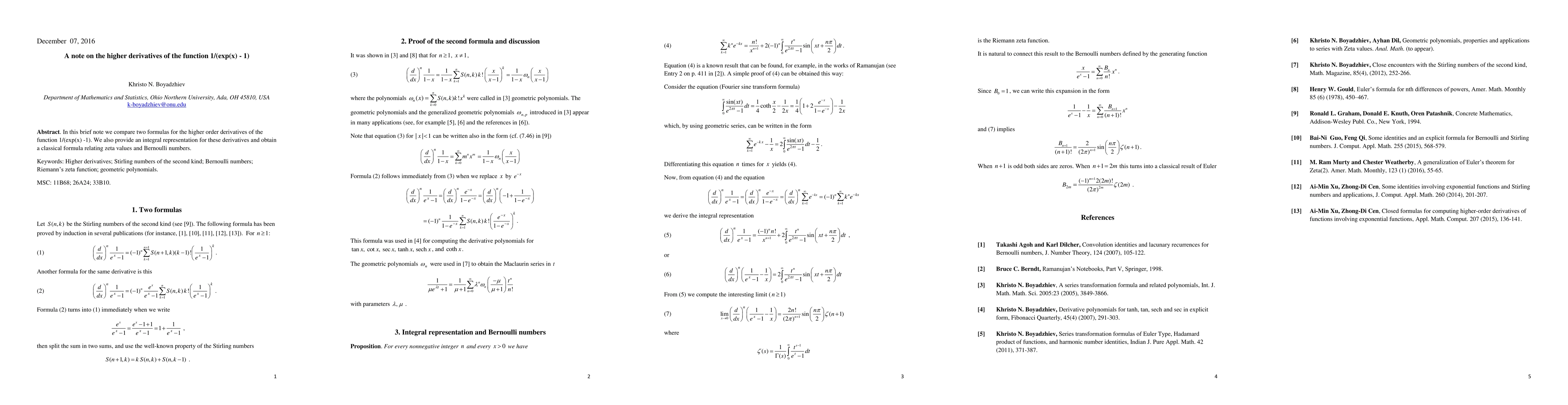 In this note we compare two formulas for the higher order derivatives of the function 1/(exp(x) -1). We also provide an integral representation for these derivatives and obtain a classical formula relating zeta values and Bernoulli numbers.