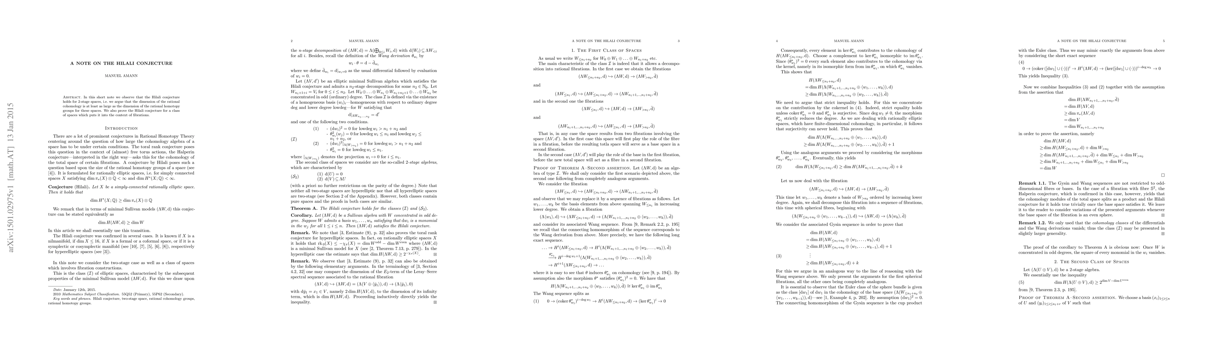 The paper confirms the Hilali conjecture for two-stage spaces, showing that the dimension of their rational cohomology is at least as large as that of their rational homotopy groups. Additionally, it extends the conjecture for a class of spaces related to fibrations.