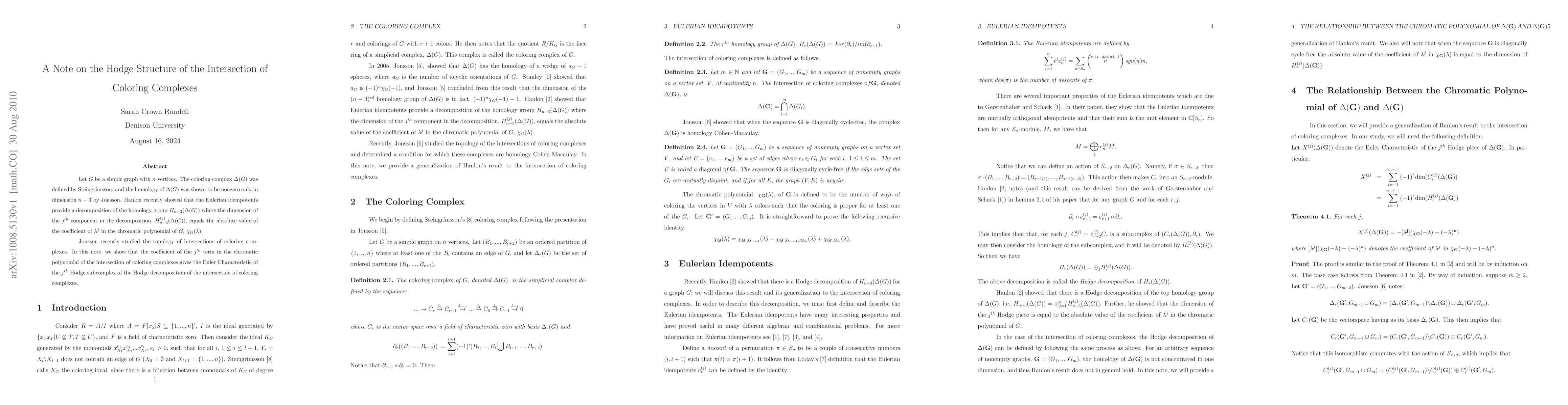 Let $G$ be a simple graph with $n$ vertices. The coloring complex $\Delta(G)$ was defined by Steingr\'{\i}msson, and the homology of $\Delta(G)$ was shown to be nonzero only in dimension $n-3$ by Jonsson. Hanlon recently showed that the Eulerian idempotents provide a decomposition of the homology group $H_{n-3}(\Delta(G))$ where the dimension of the $j^{th}$ component in the decomposition, $H_{n-3}^{(j)}(\Delta(G))$, equals the absolute value of the coefficient of $\lambda^{j}$ in the chromatic polynomial of $G$, $\chi_{G}(\lambda)$. Jonsson recently studied the topology of intersections of coloring complexes. In this note, we show that the coefficient of the ${j}^{th}$ term in the chromatic polynomial of the intersection of coloring complexes gives the Euler Characteristic of the $j^{th}$ Hodge subcomplex of the Hodge decomposition of the intersection of coloring complexes.