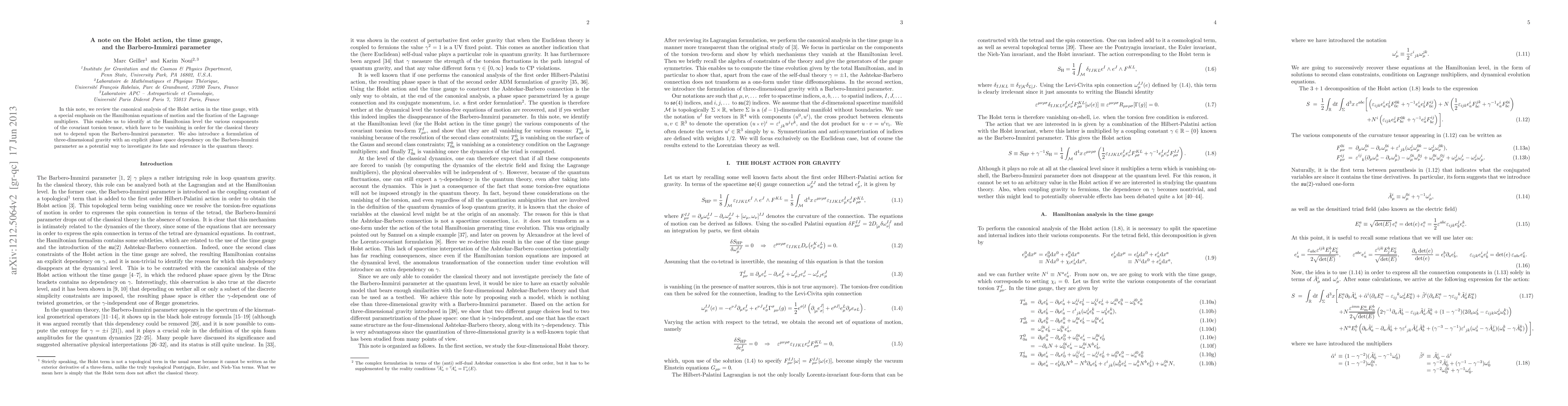 This paper reviews the canonical analysis of the Holst action in the time gauge, focusing on Hamiltonian equations and the role of Lagrange multipliers. It identifies torsion tensor components that must vanish to eliminate dependence on the Barbero-Immirzi parameter, and proposes a formulation of three-dimensional gravity to explore this parameter's relevance in quantum theory.