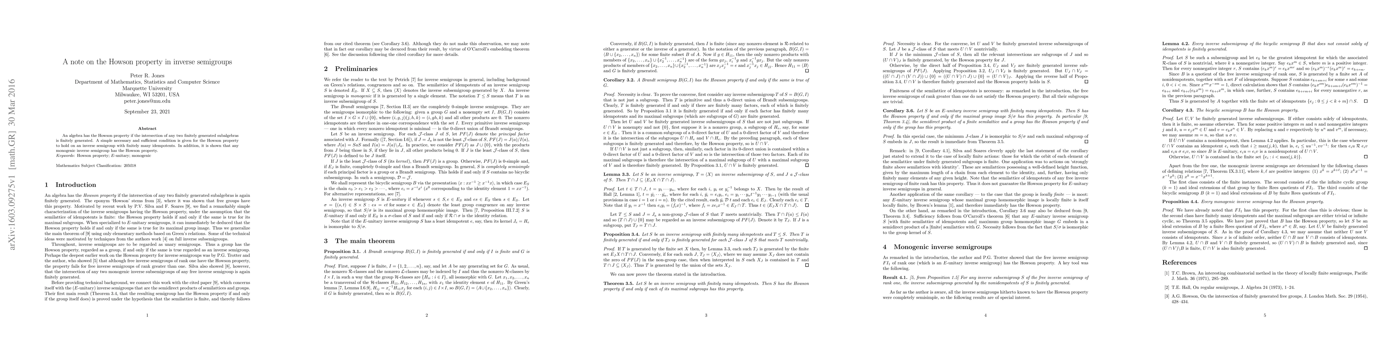 An algebra has the Howson property if the intersection of any two finitely generated subalgebras is finitely generated. A simple necessary and sufficient condition is given for the Howson property to hold on an inverse semigroup with finitely many idempotents. In addition, it is shown that any monogenic inverse semigroup has the Howson property.