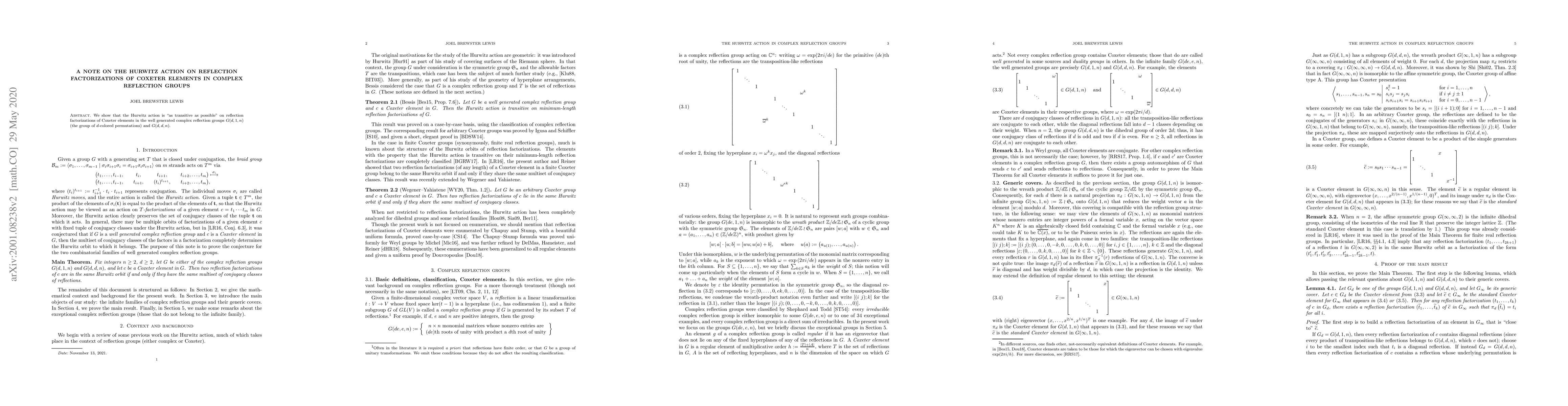 Summary: The paper demonstrates that the Hurwitz action maximally transits reflection factorizations of Coxeter elements in the complex reflection groups $G(d, 1, n)$ and $G(d, d, n)$. This finding underscores the unique transitivity properties within these well-generated groups.