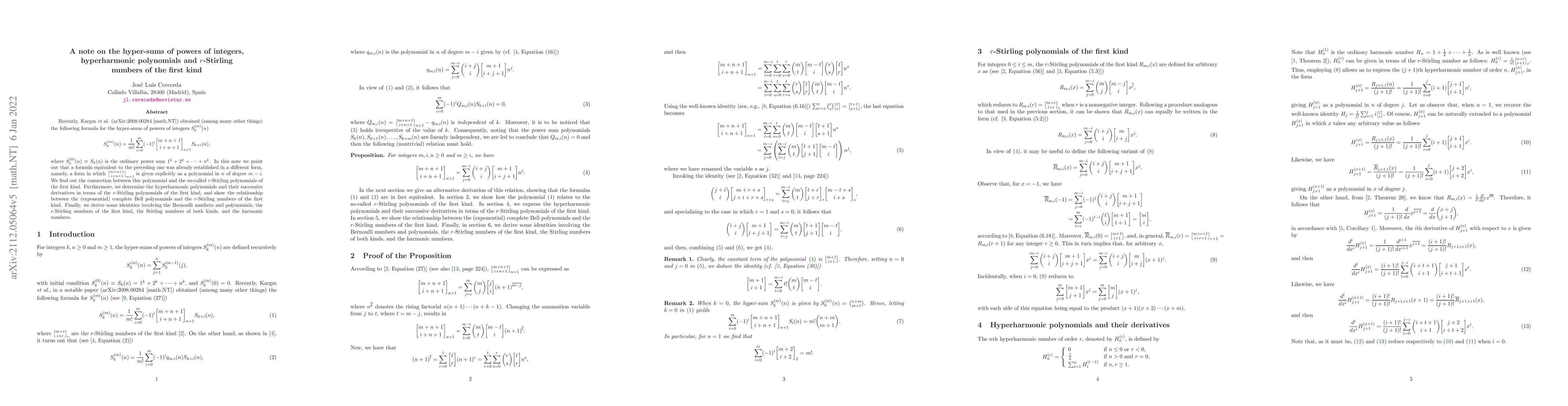 Recently, Kargin et al. (arXiv:2008.00284 [math.NT]) obtained (among many other things) the following formula for the hyper-sums of powers of integers $S_k^{(m)}(n)$ \begin{equation*} S_k^{(m)}(n) = \frac{1}{m!} \sum_{i=0}^{m} (-1)^i \genfrac{[}{]}{0pt}{}{m+n+1}{i+n+1}_{n+1} S_{k+i}(n), \end{equation*} where $S_k^{(0)}(n) \equiv S_k(n)$ is the ordinary power sum $1^k + 2^k + \cdots + n^k$. In this note we point out that a formula equivalent to the preceding one was already established in a different form, namely, a form in which $\genfrac{[}{]}{0pt}{}{m+n+1}{i+n+1}_{n+1}$ is given explicitly as a polynomial in $n$ of degree $m-i$. We find out the connection between this polynomial and the so-called $r$-Stirling polynomials of the first kind. Furthermore, we determine the hyperharmonic polynomials and their successive derivatives in terms of the $r$-Stirling polynomials of the first kind, and show the relationship between the (exponential) complete Bell polynomials and the $r$-Stirling numbers of the first kind. Finally, we derive some identities involving the Bernoulli numbers and polynomials, the $r$-Stirling numbers of the first kind, the Stirling numbers of both kinds, and the harmonic numbers.