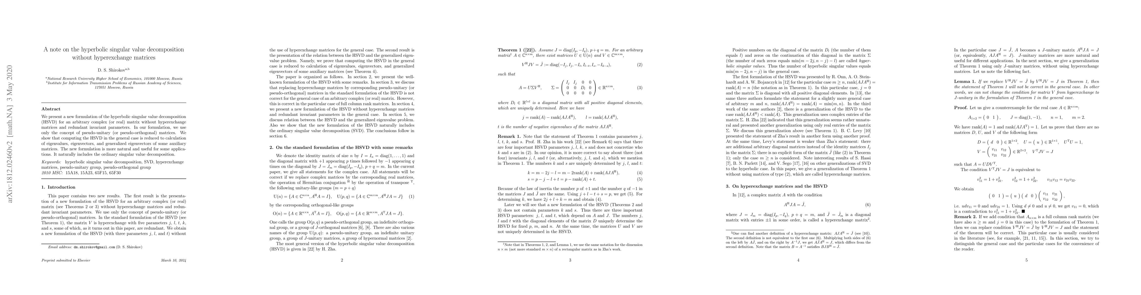 We present a new formulation of the hyperbolic singular value decomposition (HSVD) for an arbitrary complex (or real) matrix without hyperexchange matrices and redundant invariant parameters. In our formulation, we use only the concept of pseudo-unitary (or pseudo-orthogonal) matrices. We show that computing the HSVD in the general case is reduced to calculation of eigenvalues, eigenvectors, and generalized eigenvectors of some auxiliary matrices. The new formulation is more natural and useful for some applications. It naturally includes the ordinary singular value decomposition.