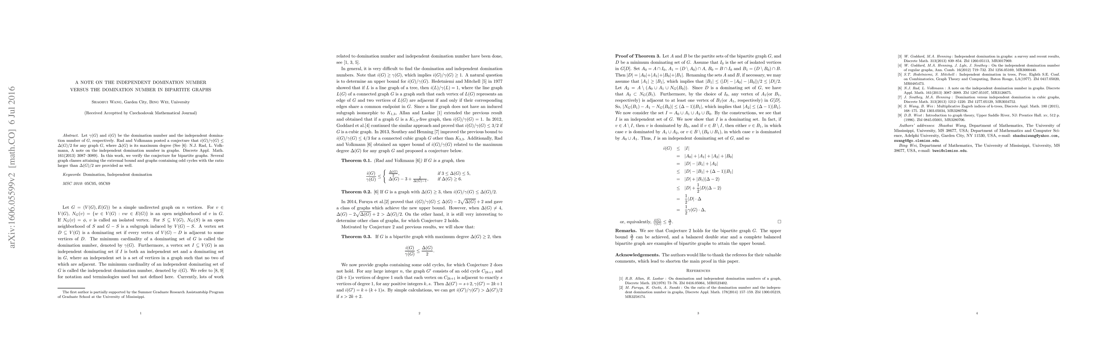 This paper verifies Rad and Volkmann's conjecture that for any bipartite graph $G$, the ratio $i(G)/ \gamma(G)$ does not exceed $\Delta(G)/2$, where $\gamma(G)$ is the domination number and $i(G)$ is the independent domination number. It also identifies specific graph classes achieving the upper bound and discusses graphs with odd cycles exceeding this ratio.
