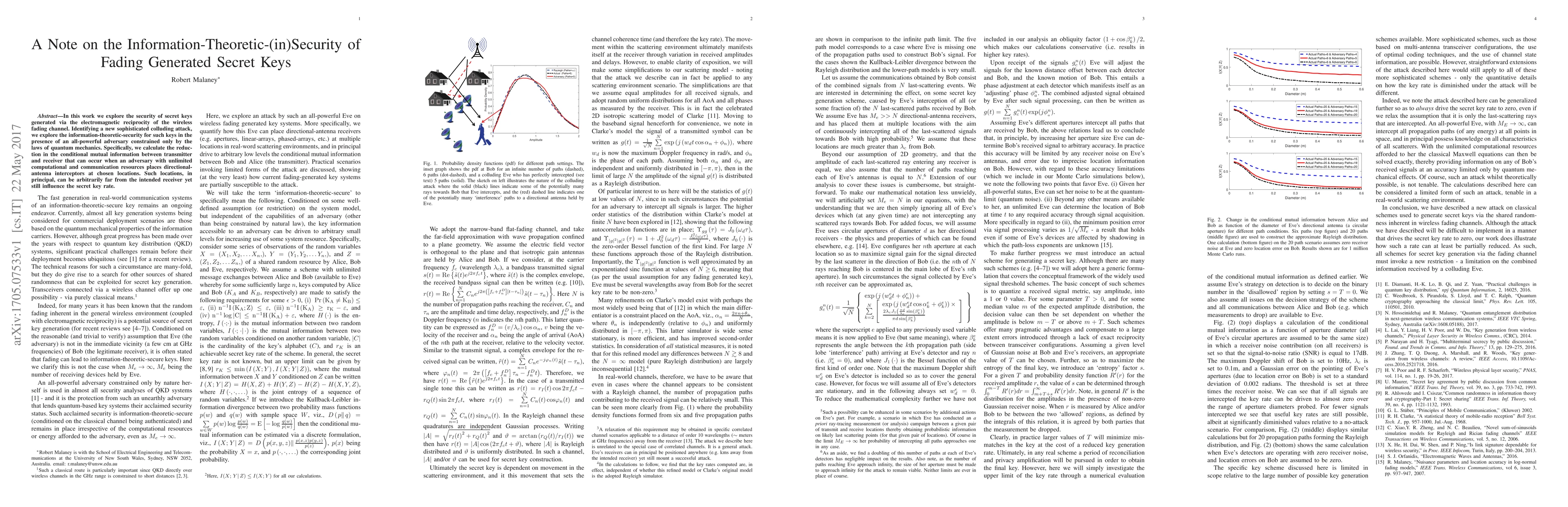 This paper investigates the information-theoretic security of secret keys generated through wireless fading channels, identifying a new colluding attack. It quantifies the impact of an all-powerful adversary using directional antenna interceptors on the conditional mutual information, revealing potential vulnerabilities even when interceptors are far from the receiver.