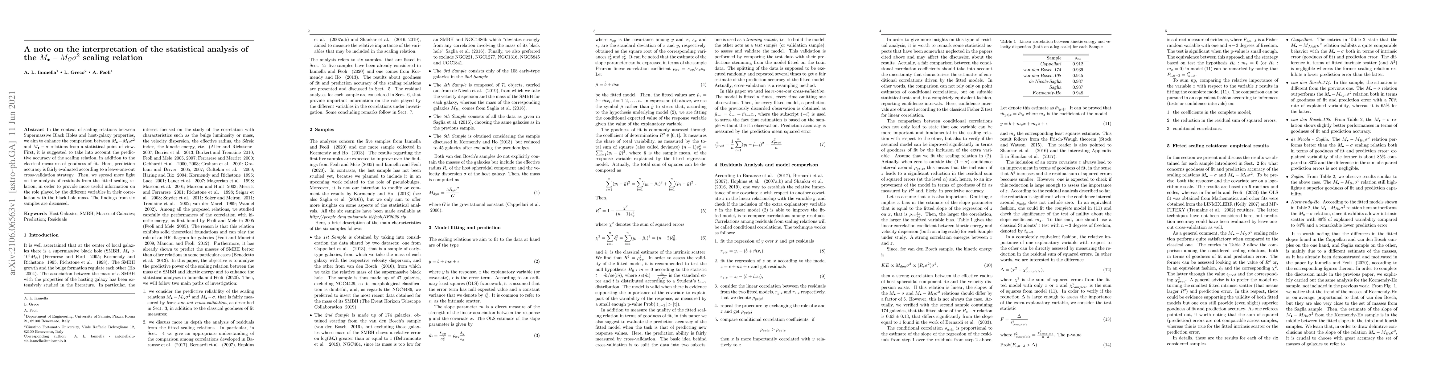 This paper examines the statistical analysis of the $M_{\bullet}-M_{G}\sigma^2$ scaling relation between supermassive black holes and host galaxy properties, emphasizing predictive accuracy via leave-one-out cross-validation and detailed residual analysis to better understand variable correlations with black hole mass. Findings from six samples are presented.