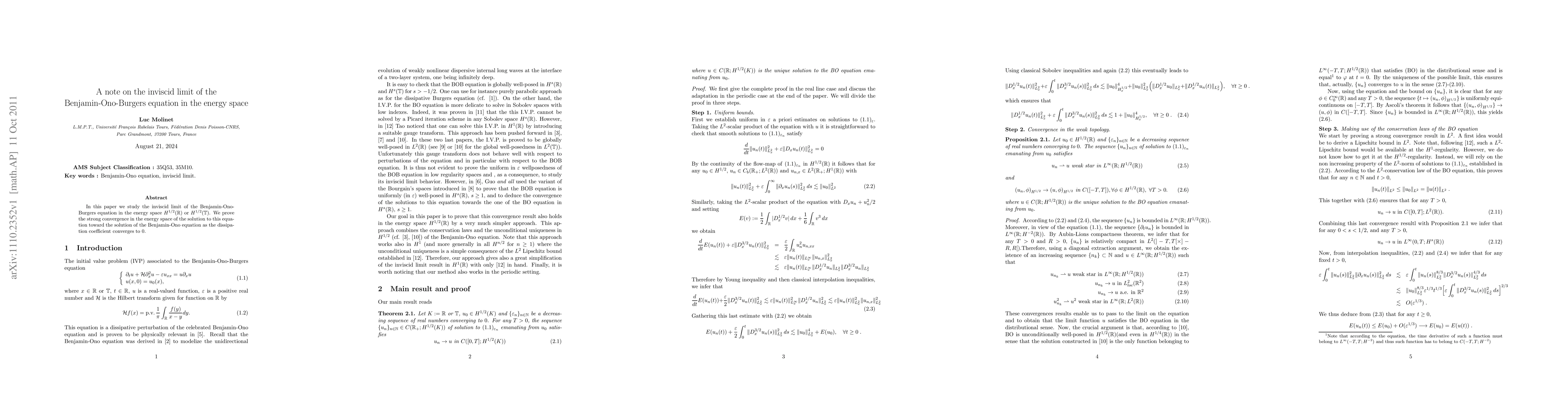 The paper investigates the inviscid limit of the Benjamin-Ono-Burgers equation in a specific energy space, showing that the solution converges to the solution of the corresponding Benjamin-Ono equation as the dissipation coefficient approaches zero.