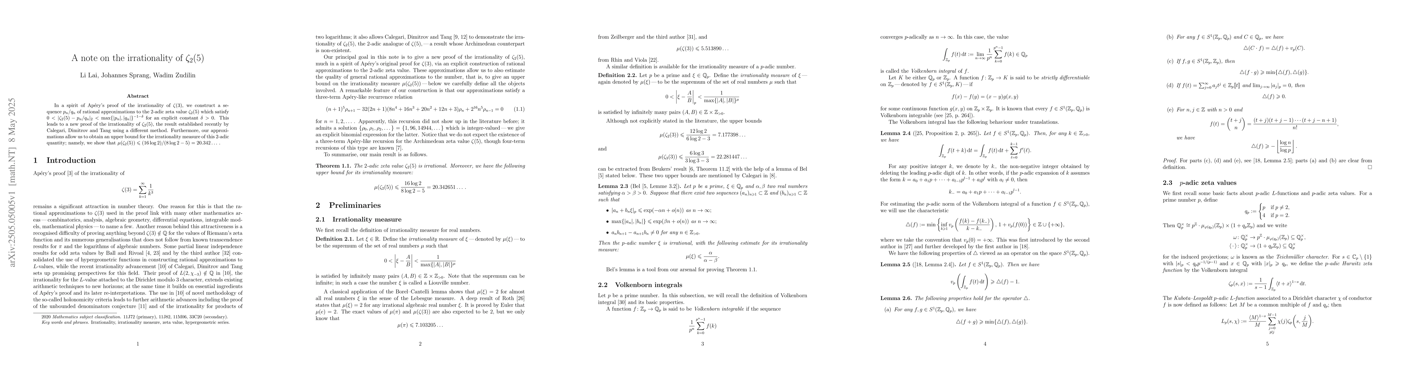 This paper constructs a sequence of rational approximations to 2-adic zeta value β_2(5) that satisfy a specific inequality, leading to a new proof of its irrationality and an upper bound on its irrationality measure.