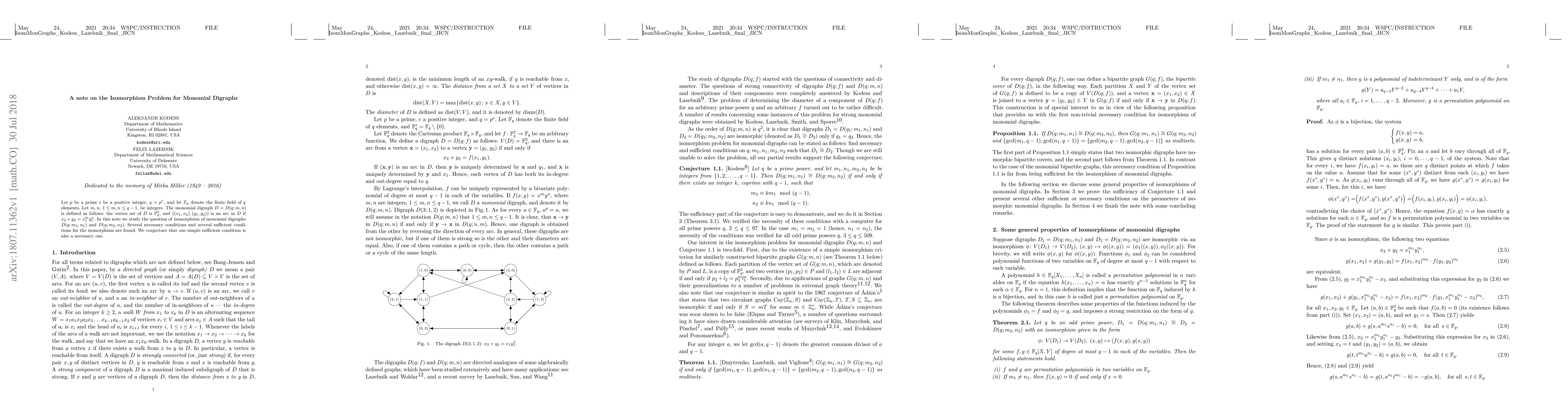 This paper investigates the isomorphism problem for monomial digraphs defined over finite fields, identifying necessary and sufficient conditions for their isomorphism. The authors conjecture that a simple sufficient condition may also be necessary for the isomorphism of these digraphs.
