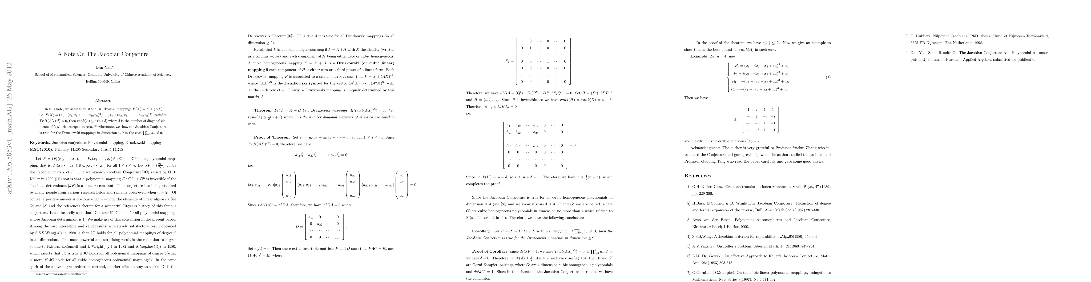 In this note, we show that, if the Druzkowski mappings $F(X)=X+(AX)^{*3}$, i.e. $F(X)=(x_1+(a_{11}x_1+...+a_{1n}x_n)^3,...,x_n+(a_{n1}x_1+...+a_{nn}x_n)^3)$, satisfies $TrJ((AX)^{*3})=0$, then $rank(A)\leq 1/2(n+\delta)$ where $\delta$ is the number of diagonal elements of A which are equal to zero. Furthermore, we show the Jacobian Conjecture is true for the Druzkowski mappings in dimension $\leq 9$ in the case $\prod_{i=1}^{n}a_{ii}\neq0$.