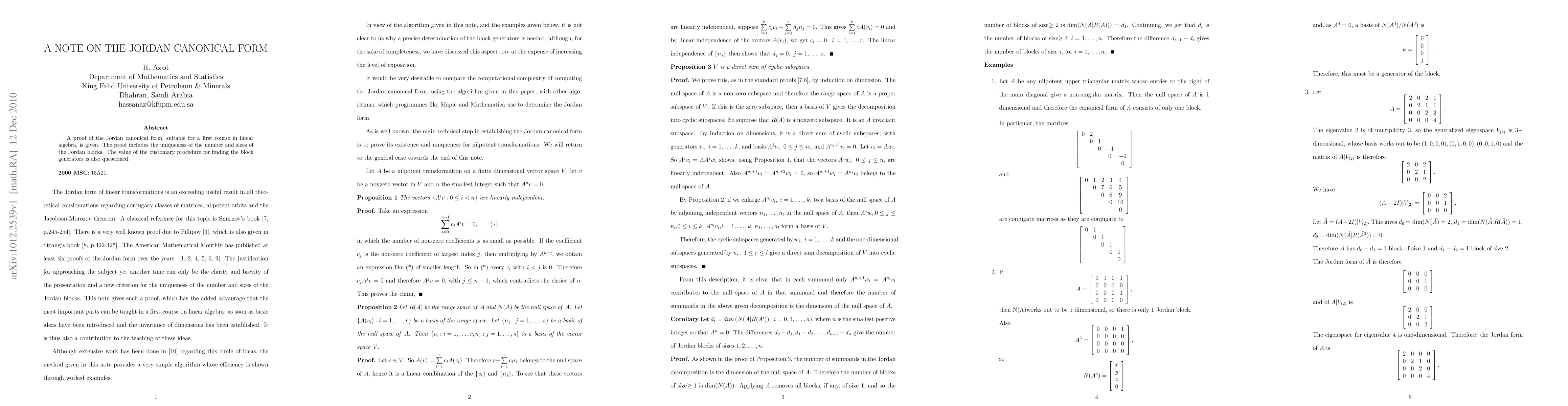 Summary: This paper provides a simplified proof of the Jordan canonical form for introductory linear algebra, emphasizing the uniqueness of the number and sizes of Jordan blocks in the decomposition.