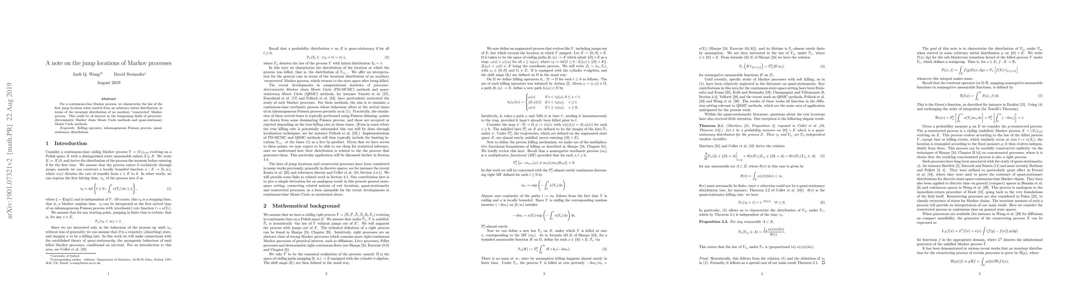 For a continuous-time Markov process, we characterize the law of the first jump location when started from an arbitrary initial distribution, in terms of the invariant distribution of an auxiliary Markov process. This could be of interest in the burgeoning fields of piecewise-deterministic Markov chain Monte Carlo methods and quasi-stationary Monte Carlo methods.