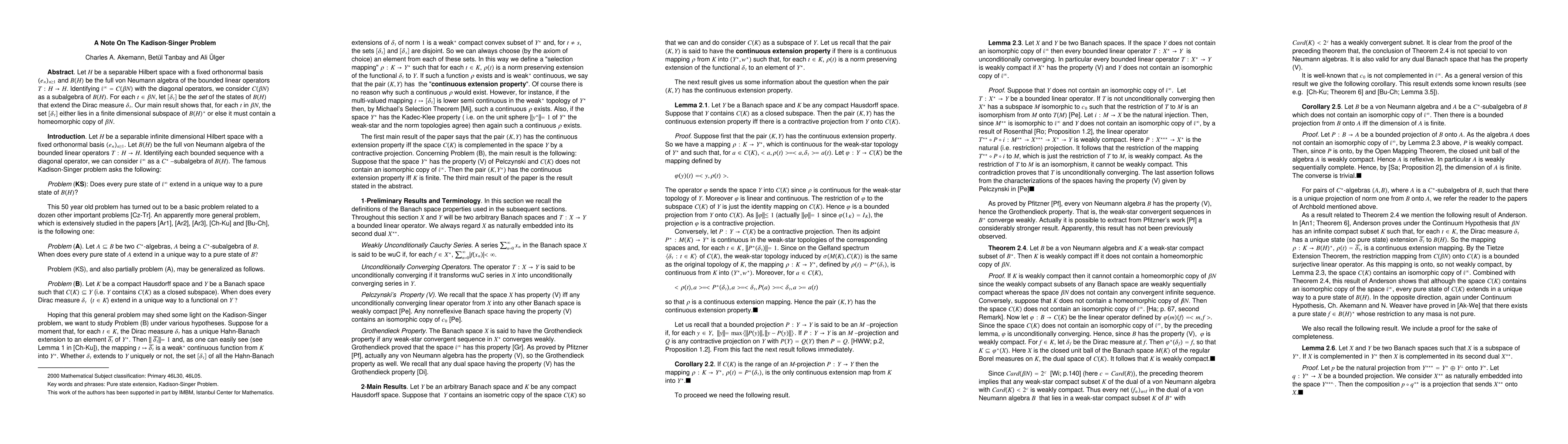 Let H be a separable Hilbert space with a fixed orthonormal basis (e_n), n>=1, and B(H) be the full von Neumann algebra of the bounded linear operators T: H -> H. Identifying l^\infty = C(\beta N) with the diagonal operators, we consider C(\beta N) as a subalgebra of B(H). For each t in \beta N, let [\delta_t] be the set of the states of B(H) that extend the Dirac measure \delta_t. Our main result shows that, for each t in \beta N, this set either lies in a finite dimensional subspace of B(H)* or else it must contain a homeomorphic copy of \beta N.