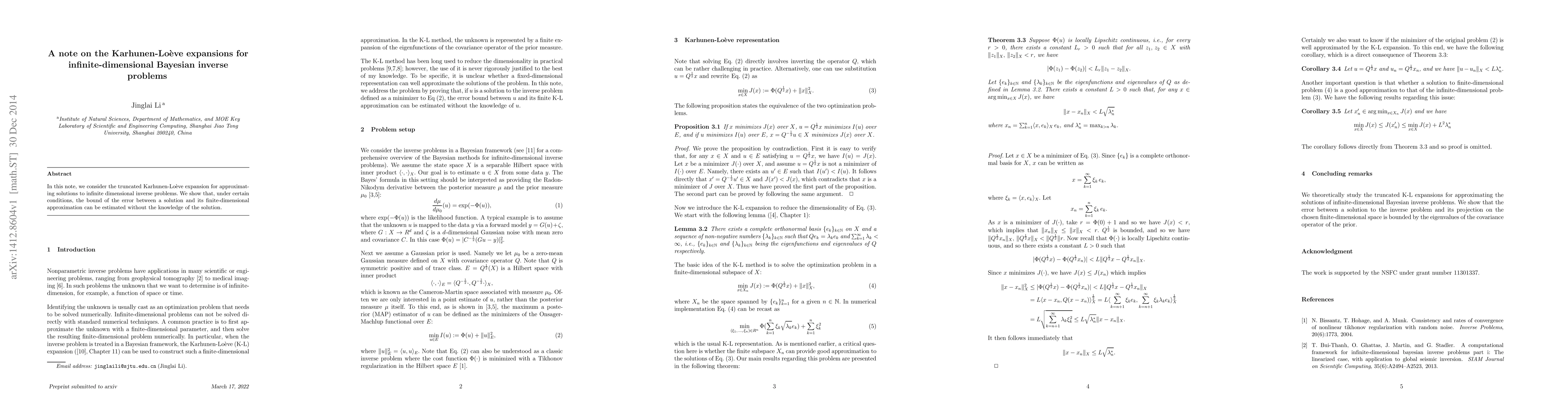 Summary: This paper explores the use of truncated Karhunen-Loève expansions to approximate solutions for infinite-dimensional Bayesian inverse problems, demonstrating that error bounds can be estimated without needing the actual solution, under specific conditions.