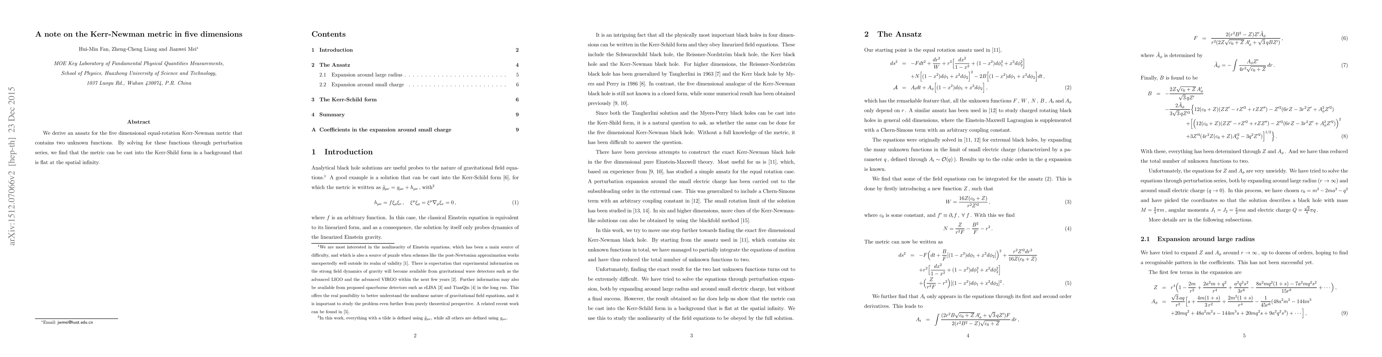 Summary: This paper derives an ansatz for the five-dimensional Kerr-Newman metric, solving for two unknown functions via perturbation series, and demonstrates that the metric can be expressed in Kerr-Schild form with a flat background at spatial infinity.
