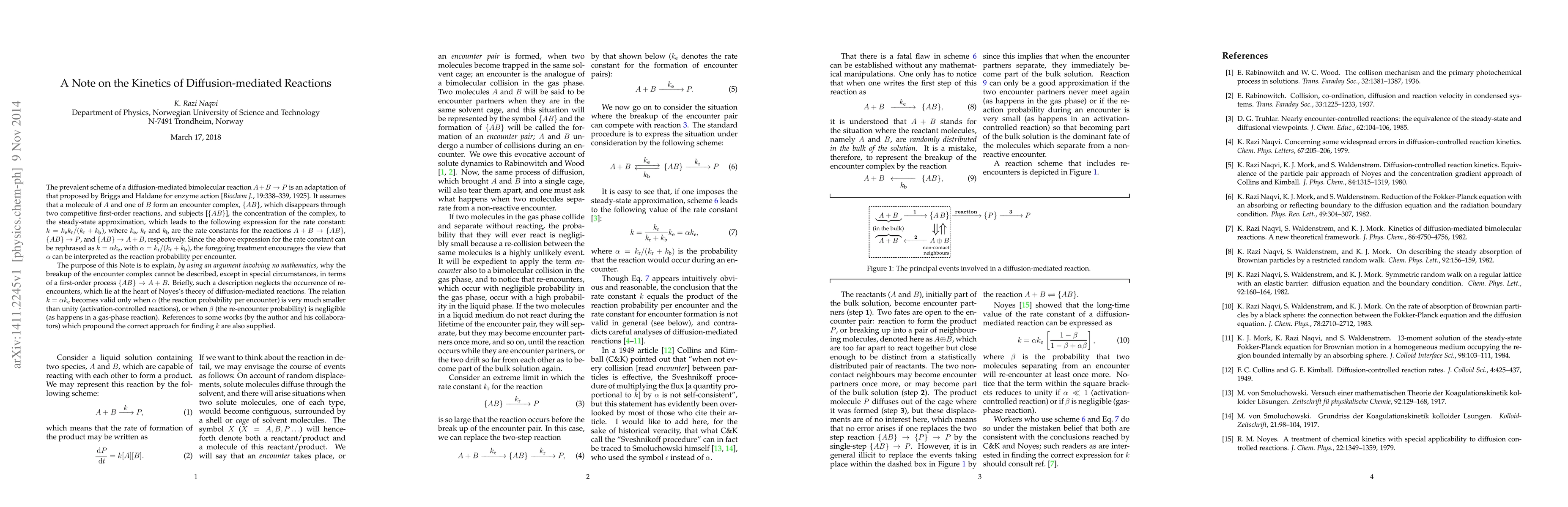The prevalent scheme of a diffusion-mediated bimolecular reaction $A+B\rightarrow P$ is an adaptation of that proposed by Briggs and Haldane for enzyme action [{\em Biochem J.\/}, 19:338--339, 1925]. The purpose of this Note is to explain, {\em by using an argument involving no mathematics\/}, why the breakup of the encounter complex cannot be described, except in special circumstances, in terms of a first-order process $\{AB\}\rightarrow A+B$. Briefly, such a description neglects the occurrence of re-encounters, which lie at the heart of Noyes's theory of diffusion-mediated reactions. The relation $k=\alpha k_{\mbox{\scriptsize e}}$ becomes valid only when $\alpha$ (the reaction probability per encounter) is very much smaller than unity (activation-controlled reactions), or when $\beta$ (the re-encounter probability) is negligible (as happens in a gas-phase reaction). References to some works (by the author and his collaborators) which propound the correct approach for finding $k$ are also supplied.